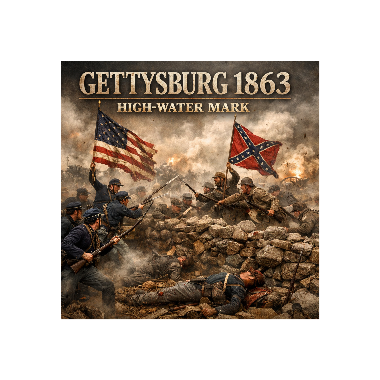 Epic heavy/power metal, solemn and cinematic, 168 BPM, D minor, Standard tuning (or Drop D), Intro: distant cannon-like drum hits + marching snare rolls and low choir pad, then galloping riffs and twin-lead harmonies, Verses: tight palm-mutes, double-kick drive, bass on 8ths; artillery-like stop-start hits, Pre-chorus rises with layered vocals, Chorus: huge hymn-like arena hook with gang shouts (“GETTYSBURG!” “HIGH-WATER!”), choir backing and wide guitars, Bridge: slow, heavy halftime for the long march, then surge back to full speed and a melodic solo, ending with an extended final chorus, Vocals: expressive male tenor with gritty edge; occasional spoken lines, Lyrics historically grounded: July 1–3, 1863; Cemetery Ridge; July 3 Pickett’s Charge after artillery; repulse at the stone wall/Angle (‘high-water mark’), No modern slang