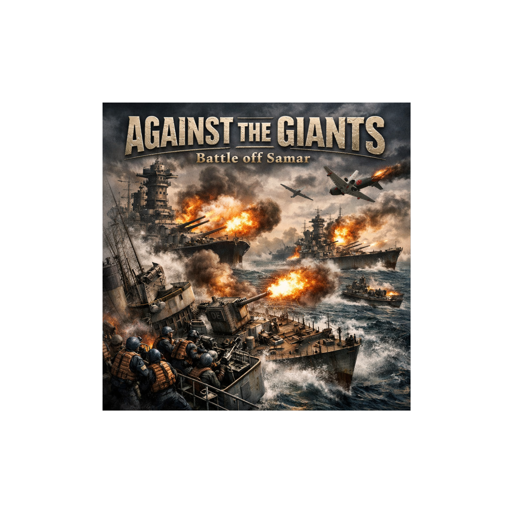 Epic heavy/power metal with desperate naval heroism, 182 BPM, E minor, Drop D, Intro: radar ping FX, storm wind pad, then urgent galloping riff, Verses: tight palm-muted chugs, relentless double-kick, bass 8ths; sharp stop-start hits like emergency turns and shell splashes, Pre-chorus: rising chords, tension like closing battleships, Chorus: huge arena hook with gang shouts “SAMAR!” “AGAINST THE GIANTS!”, choir backing wide guitars, Bridge/halftime: crushing stomp for torpedo runs and smoke screens, then snap back to full speed, Solo: melodic/harmonic minor run, bends, harmonized resolve, Vocals: intense heroic tenor, documentary tone; no modern slang, Lyrics grounded: 1944, small escort carriers and destroyers charge vastly superior force, smoke, torpedoes, sacrifice, forcing retreat against odds, VERY emotional and EPIC