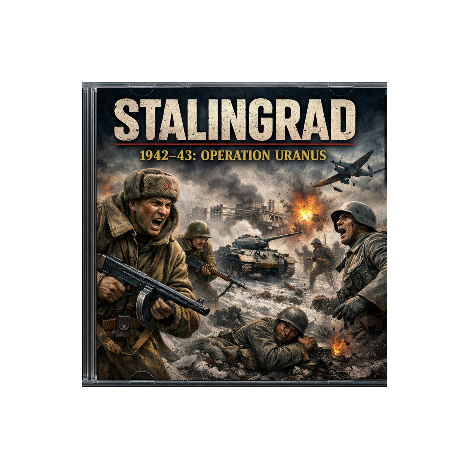 Aggressive heavy/power metal with cold Eastern-European melodic flavor, 178 BPM, G minor, Drop D, Intro: distant artillery “booms” (kick/toms) + low choir pad, then slam into tight galloping riffs and percussive palm-mutes, Verses: relentless double-kick, sharp snare, bass driving 8ths; add stop-start hits like shell impacts and radio calls, Pre-chorus rises with climbing chords and layered vocals, Chorus: massive icy arena hook with gang shouts (“STALINGRAD!” “URANUS!” “THE RING!”), choir backing and harmonized twin leads, Mid-song: heavy halftime stomp for winter/encirclement closing, then snap back to full speed; melodic/neo-classical solo with harmonic minor runs, bends, harmonized ending, Vocals: intense male tenor with gritty edge, commanding storytelling, occasional spoken lines, Lyrics historically grounded: street fighting on Volga, 6th Army under Paulus, Soviet