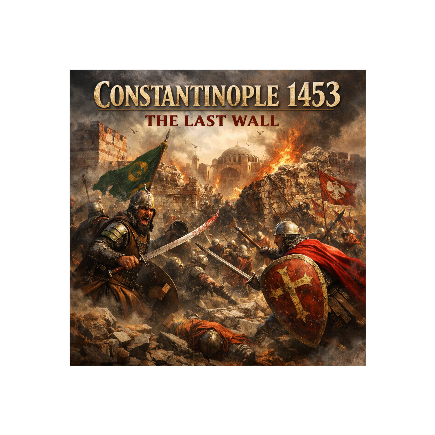 Dark epic heavy metal fused with power metal and doom weight, 158 BPM, F# minor, Drop C#, Intro: Byzantine-tinged clean guitar motif + low choir pad + distant “bombard” hits (kick/toms), then heavy stomp riffs with occasional gallop, Verses: tight palm-mutes, double-kick bursts, martial snare; bass thick and audible, Pre-chorus rises with climbing chords and layered vocals, Chorus: massive mournful arena hook with gang shouts (“THE LAST WALL!” “1453!” “HOLD FAST!”), choir backing and wide harmonized guitars, Mid-song: halftime crushing section for bombardment/breaches (tom-heavy, chug riffs), then surge back to full speed; melodic/neo-classical solo with harmonic minor runs, bends, harmonized ending, Vocals: dramatic male tenor with gritty edge, solemn storytelling; occasional spoken lines, Lyrics historically grounded: April–May 1453, Theodosian walls, Ottoman artillery