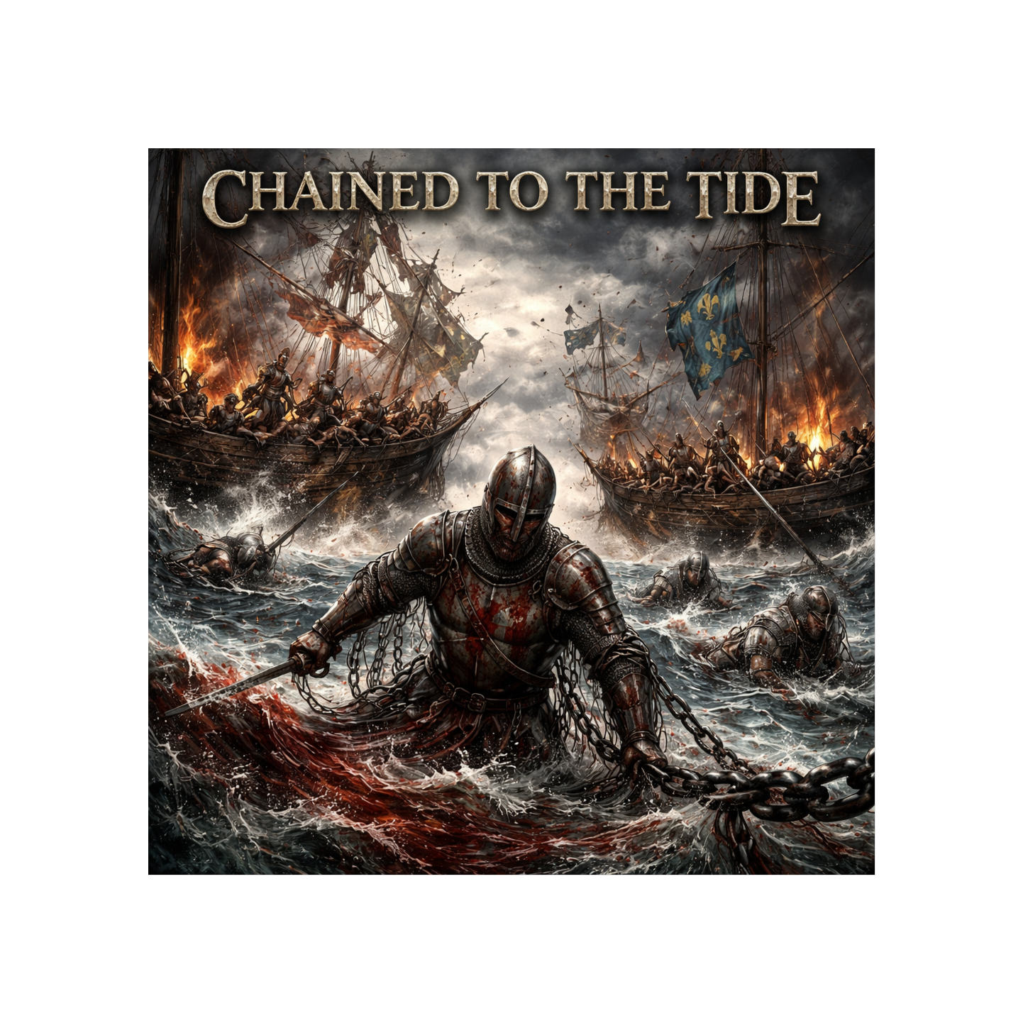 Epic heavy/power metal with medieval naval brutality, 176 BPM, D minor, Drop D, Intro: sea-wind ambience, creaking wood FX, low choir pad, then fast galloping riff, Verses: tight palm-muted chugs, relentless double-kick, bass 8ths; stop-start hits like grappling impacts and boarding shocks, Pre-chorus: rising chords, tension like ships closing in a narrow harbor, Chorus: massive arena hook with gang shouts “SLUYS!” “CHAINED!” “NO ESCAPE!”, choir backing and harmonized twin leads, Bridge/halftime: crushing stomp for mass boarding and melee; snap back to full speed, Solo: melodic/harmonic minor run, bends, harmonized resolve, Vocals: commanding male tenor with gritty edge, documentary tone; no modern slang, Lyrics grounded: 1340, fleets chained together, narrow waters, archers dominate, boarding warfare, decisive naval slaughter that secures control of the Channel, VERY EPIC