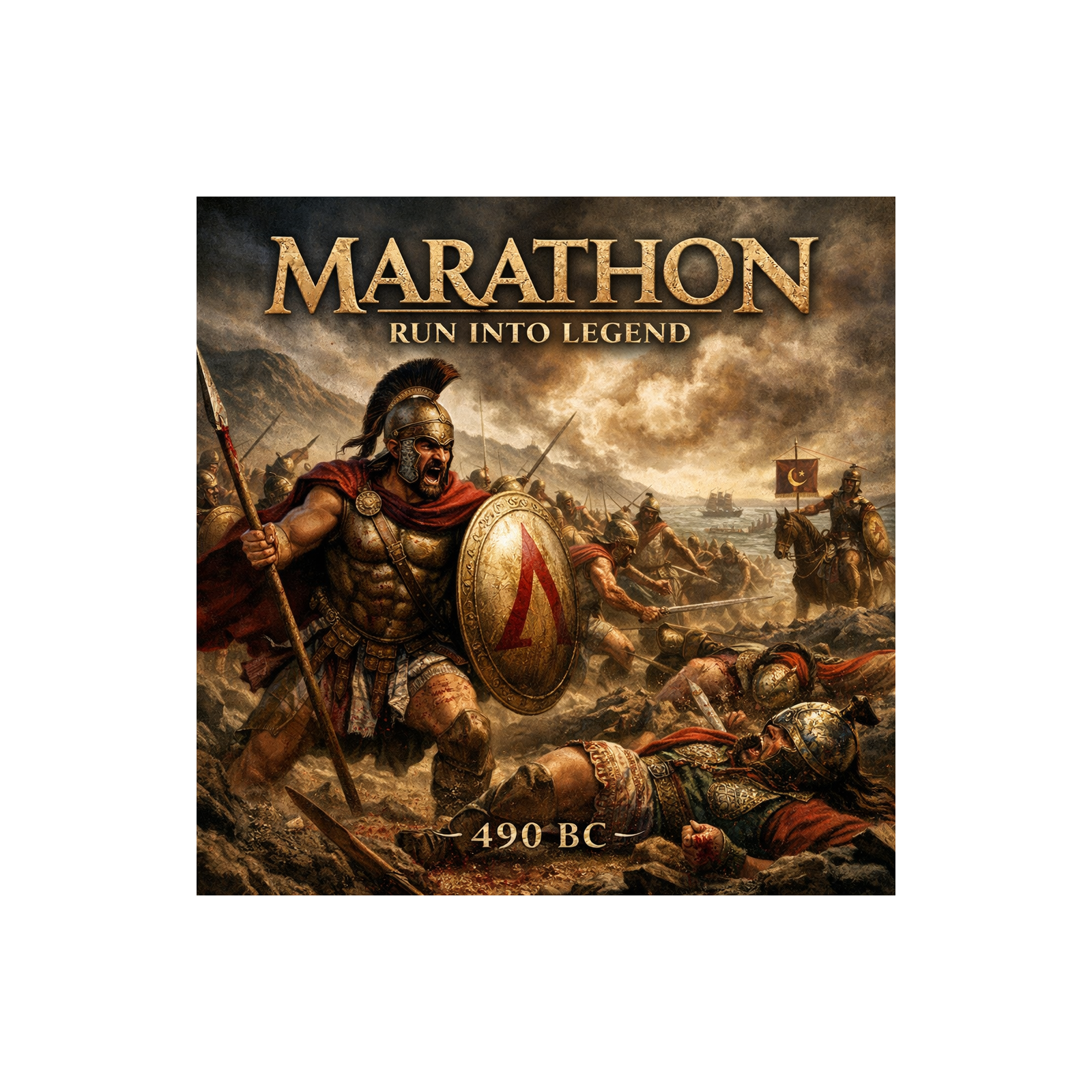 True + power metal hybrid, 176 BPM, E minor, Drop D, Intro with distant war horns/low choir pad, then explosive galloping riffs (tight palm-mutes) and bright twin-lead harmonies, Verses: relentless double-kick, sharp snare, bass driving eighths; pre-chorus climbs with rising chord progression and layered vocals, Chorus: huge heroic anthem with gang shouts (“ATHENS!” “MARATHON!”), triumphant melody and choir backing, Bridge: halftime stomp with toms, then fast build into neo-classical/melodic solo (harmonic minor flavor, bends, vibrato, harmonized finish), Vocals: powerful male tenor with gritty edge, commanding storytelling, occasional shouted lines and breathy whispers for tension, Lyrics must stay historically grounded: Athenian & Plataean hoplites vs Persian expedition (Datis/Artaphernes), Miltiades’ decision, arrow volleys, charge across the plain, wings enveloping, Persians driven to ships