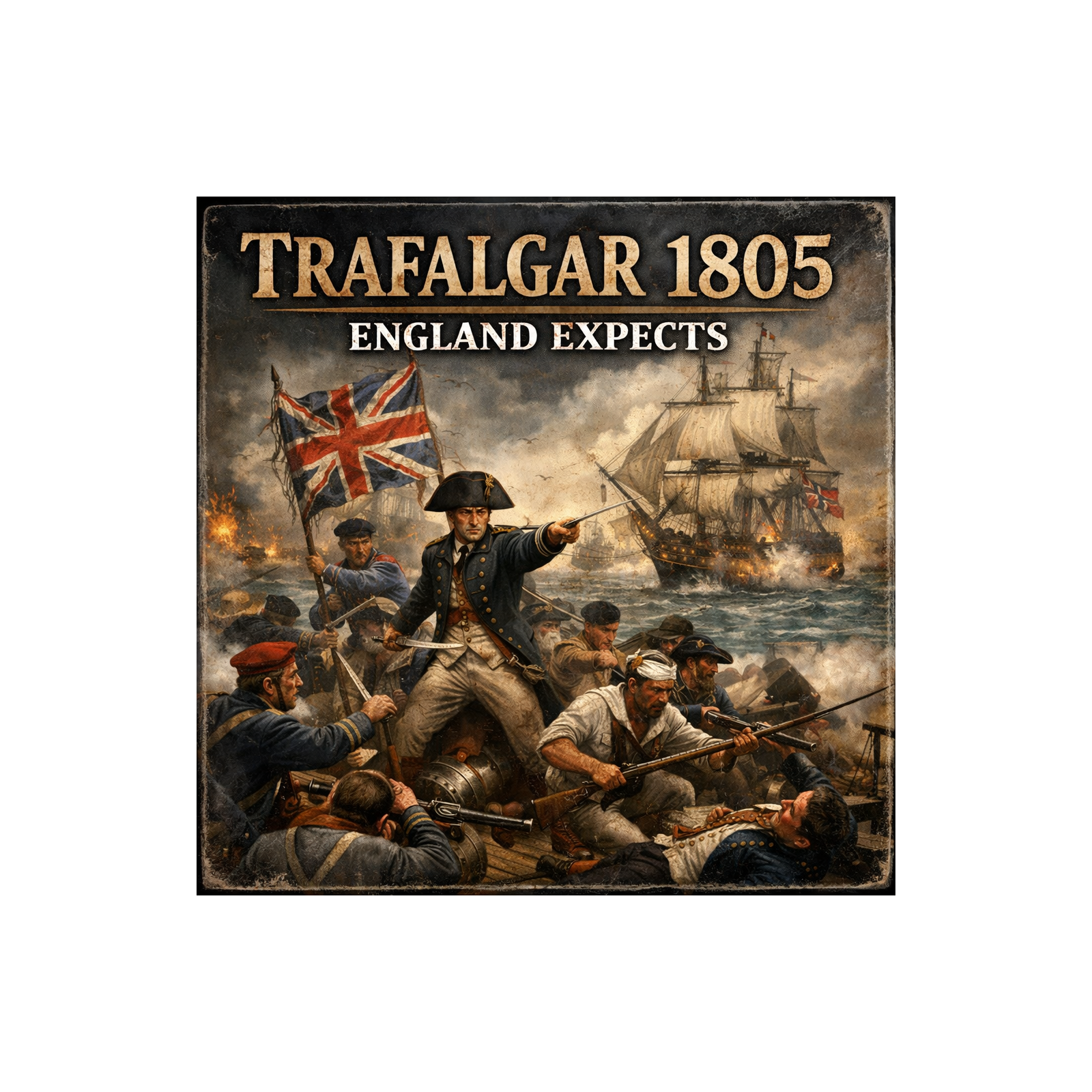 Classic heavy metal fused with power metal, 174 BPM, A minor, Standard tuning (or Drop D), Intro: sea-wind clean guitars + distant horns + marching snare like ship drums, then explode into galloping riffs and bright harmonized twin leads, Verses: tight palm-muted chugs, double-kick bursts; add huge “cannon” accents (kick/tom hits) and stop-start breaks to mimic broadsides, Pre-chorus rises with climbing chords and layered vocals, Chorus: massive nautical arena hook with gang shouts (“TRAFALGAR!” “ENGLAND EXPECTS!” “TWO COLUMNS!”), choir pad subtly behind and wide guitars, Mid-song: halftime crushing “boarding” section with stomping riff, then accelerate into melodic/neo-classical solo (harmonic minor touches, bends, harmonized ending), Vocals: heroic male tenor with gritty edge, commanding storytelling; occasional spoken signal-call lines, Lyrics historically grounded: 21 Oct 1805;