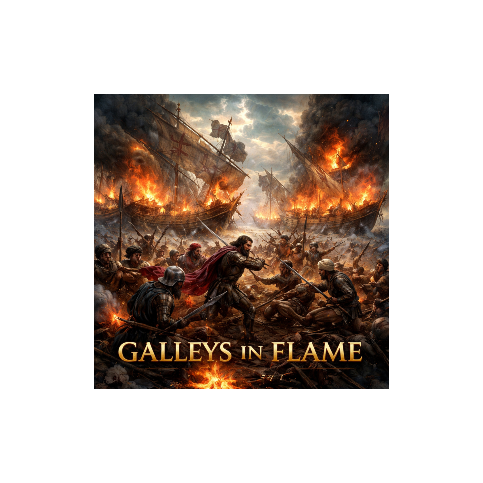 Epic heavy/power metal with nautical warfare intensity, 178 BPM, C minor, Drop D, Intro: sea-wind clean guitars + low choir + snare rolls like ship drums, then fast galloping riffs and tight chugs, Verses: relentless double-kick, bass 8ths; add huge “cannon” accents (kick/toms) and stop-start breaks to mimic broadsides and ramming, Pre-chorus rises with layered vocals, Chorus: massive arena hook with gang shouts (“LEPANTO!” “GALLEYS!” “IN FLAME!”), choir pad behind and harmonized twin leads, Mid-song: halftime crushing “boarding” stomp section, then snap back to full speed; melodic/neo-classical solo with harmonic minor runs, bends, harmonized ending, Vocals: heroic tenor with grit, documentary delivery, Lyrics grounded: Oct 1571, line-of-battle galley clash, cannon/arquebus fire, boarding, flagship struggle, Ottoman center breaks, decisive victory, No modern slang