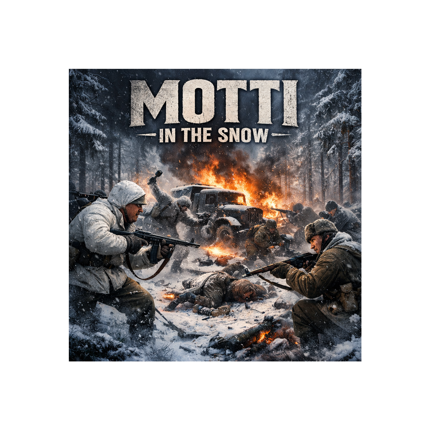 True heavy metal + power metal with icy folk edge, 176 BPM, E minor, Drop D, Intro: cold wind pad + low choir + brief melodic motif with Nordic/folk contour, then fast galloping riffs and tight chugs, Verses: relentless double-kick, crisp snare; bass 8ths; stop-start hits like ski ambushes, Pre-chorus climbs with layered vocals, Chorus: huge arena hook with gang shouts (“TALVISOTA!” “MOTTI!” “IN THE SNOW!”), choir backing and harmonized leads, Mid-song: halftime crushing section for freezing nights and supply cuts, then surge back; melodic solo with harmonic minor touches, Vocals: heroic tenor with grit, Lyrics grounded: 1939–40 Winter War, deep cold, forests/lakes, ski troops, “motti” tactics cutting columns, defensive endurance, No modern slang
