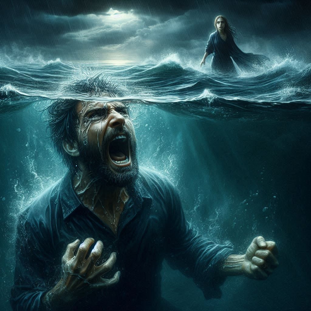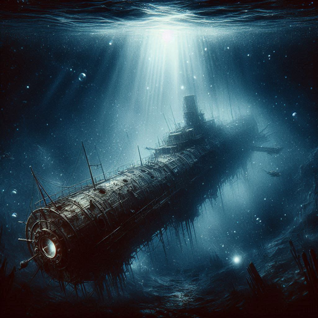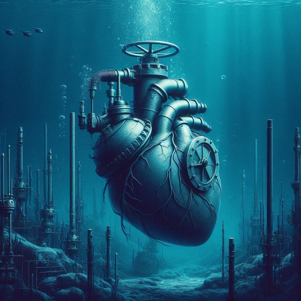 Submerged down tempo industrial doom metal, deep sub-bass, waltz, male very deep low tone voice, out of breath wining, oppressive, down tempo, drone metal, underwater, drowning, sub bass, almost silence, ultra low volume endless reverb, vocals echoing into the void, Instruments and voice call into infinite blue emptiness
