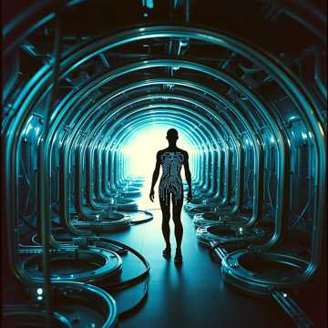 Dark industrial-leaning cinematic score with mechanical rhythms, distorted bass pulses, metallic percussion, and subtle analog synth drones, Male vocals detached and mechanical in tone, Intro and verses delivered in near-monotone with precise timing, Chorus fuller and warmer with layered harmonies for contrast, Bridge spoken with echo and delay effects, Outro breath-heavy vocals dissolving into the instrumental