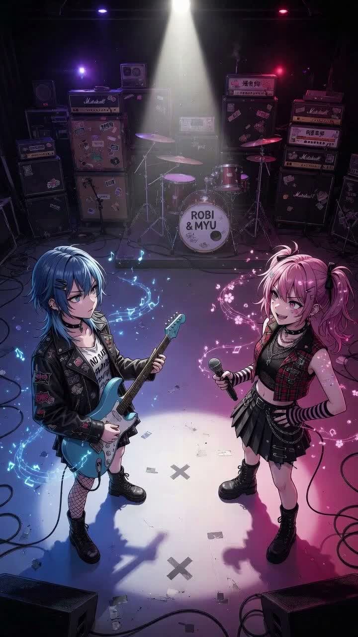 Robi Rock, Modern Pop Punk, High-Energy J-Rock, 185 BPM, Female Vocal, Fast Aggressive Drumming, Overdriven Guitar Wall, Heavy Punchy Sub-Bass, Emotional Grit, High-End Pro Production, Wide Stereo Image, The music features dancing guitar sounds, ultra-fast drum beats, and lightning-fast violin playing, A female vocal duet with high-pitched, falsetto-tinged, almost screaming vocals
