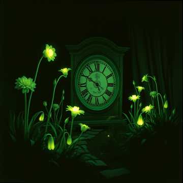 Sound design: faint clock ticks, echoes, creaks, or whispers of wind through gears and vines