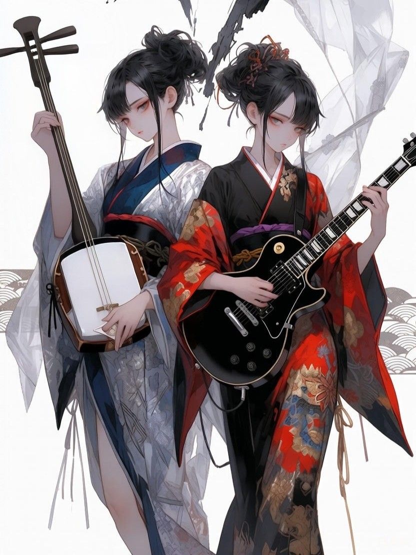Instrumentation: Distorted electric guitar with heavy riffs, punchy bass, double-kick drums, shamisen, koto, taiko drums, and subtle electronic effects