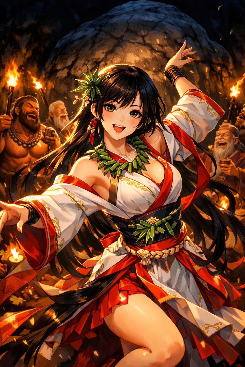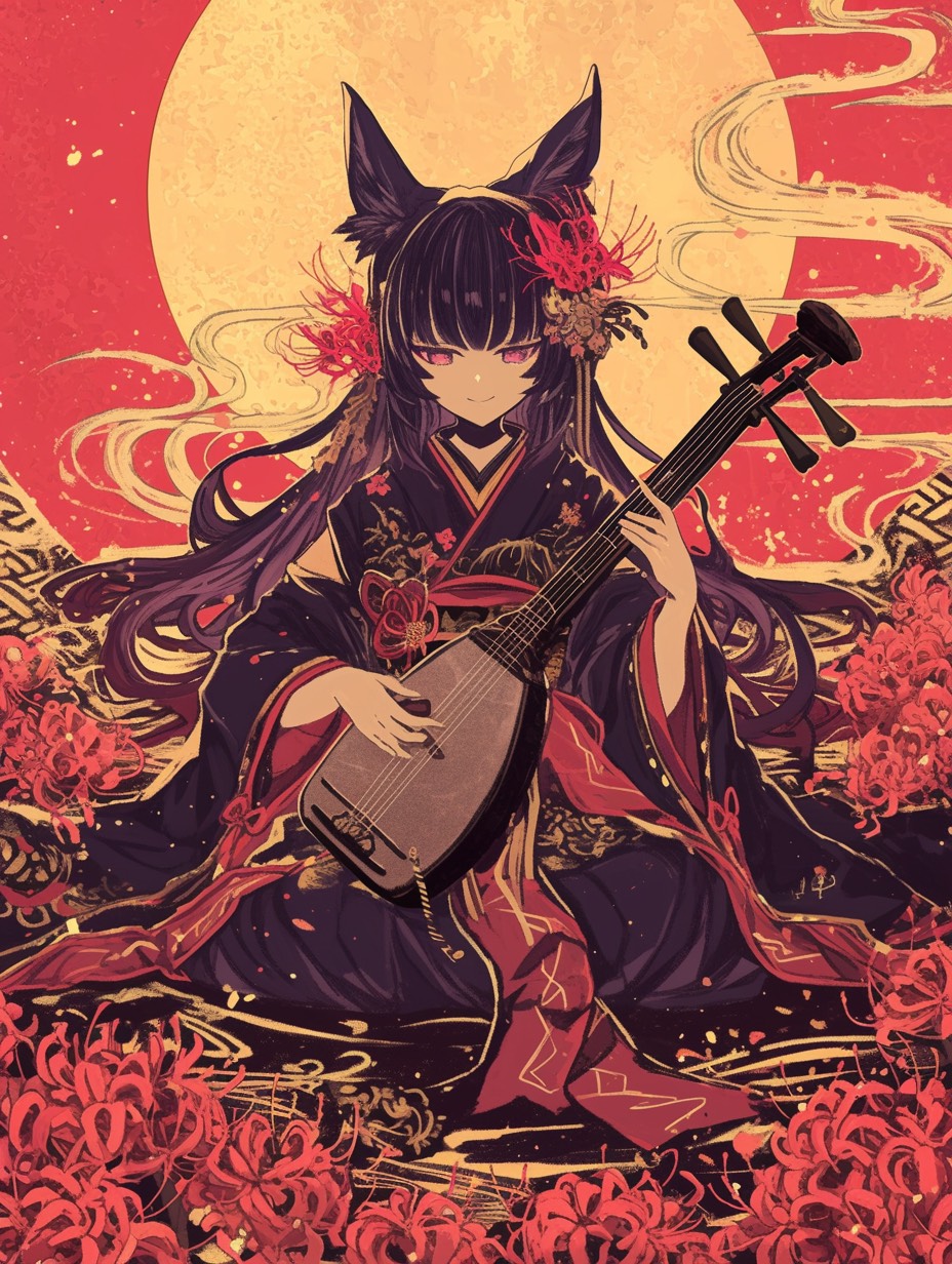 female vocals, dance, fast, shamisen, shakuhachi, taiko, japanese anime style, J-Rock, Electric guitar
