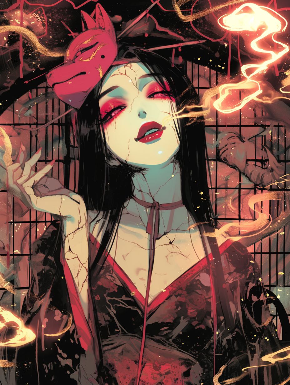 female dark whisper & powerful vocal, slow to mid tempo, heavy taiko drums, shamisen & koto with distortion, deep reverb, cold ambient pads, minimal melody, oppressive silence gaps, ritualistic rhythm, cinematic darkness, forbidden shrine vibe