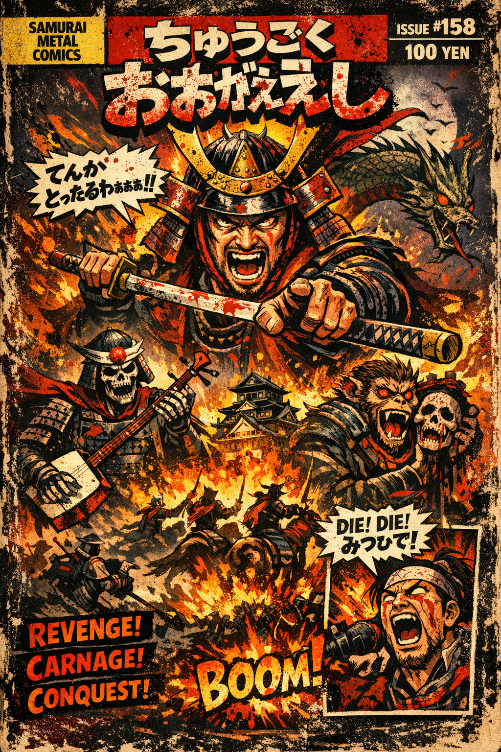 Arrangement: Start with a suspenseful koto melody and taiko hits, then explode into a high-energy rock section, Alternate between aggressive rock and traditional Japanese interludes, Build to a climactic finale with intense guitar solos, taiko accents, and a commanding vocal performance with shouts, growls, and rolled R's, End with a sudden, dramatic stop