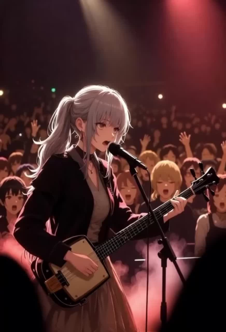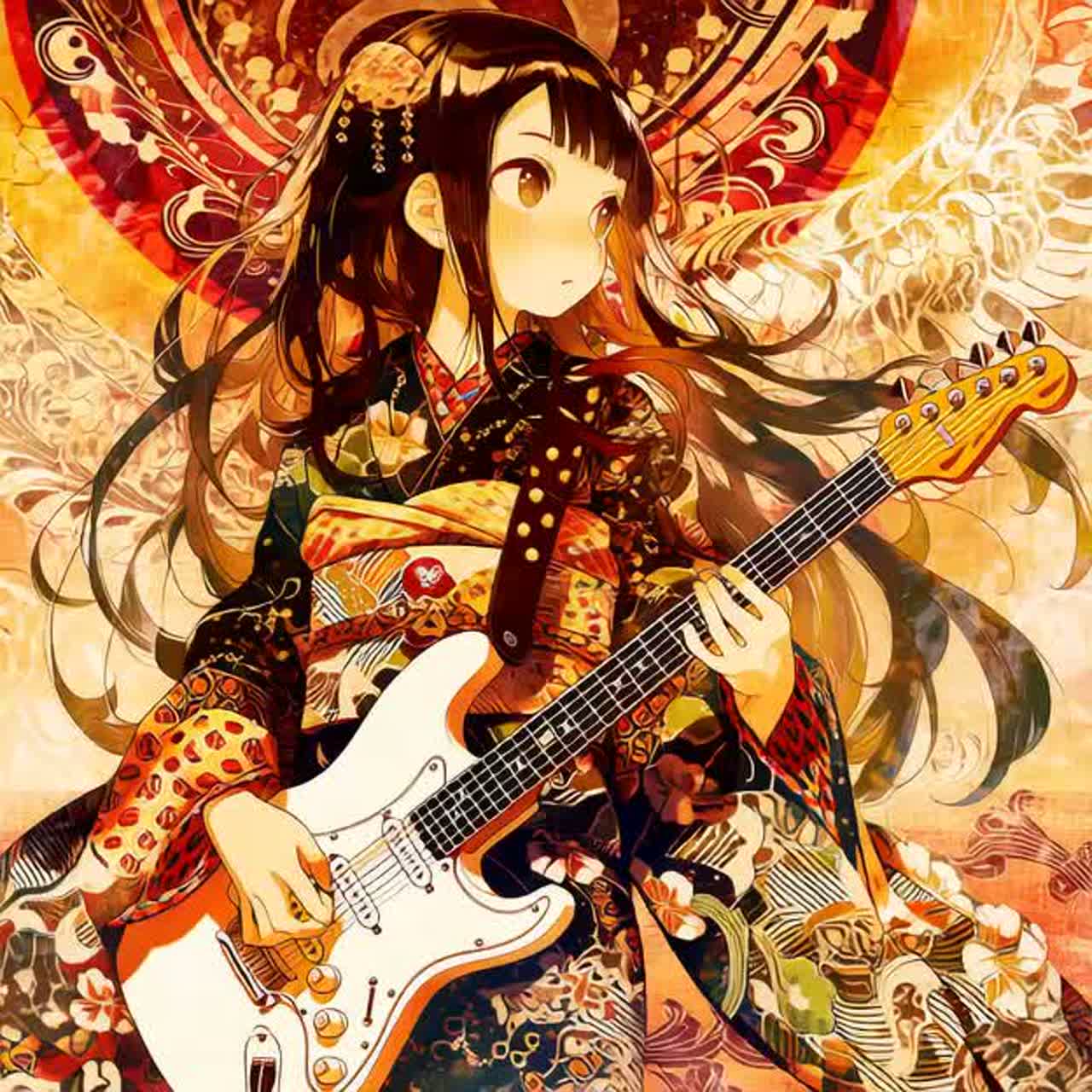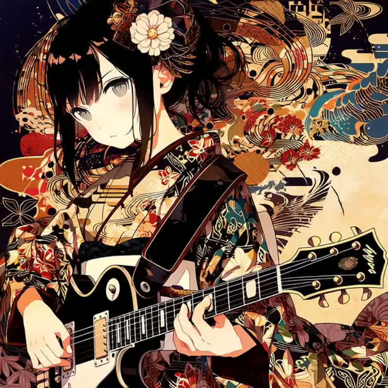 High-speed Japanese rock with a melancholic twist, 180–200 BPM, Female vocal: dramatic and emotional, soaring in choruses while maintaining clarity in verses, Rich layering of traditional Japanese instruments (koto, shamisen) providing a beautiful and melodic backdrop, Rhythm guitars: heavy distortion for aggressive, tight riffs; maintain a strong presence in verses and choruses, Use palm-muted sections for verses, with crunchy power chords in the chorus to create contrast, Clean guitar accents can be layered for atmospheric effects, Bass: punchy and melodic, locking tightly with the kick; use a warm tone with some grit, Drums: fast, energetic, with snappy snares and double-kick for a driving force; occasional fills to add excitement