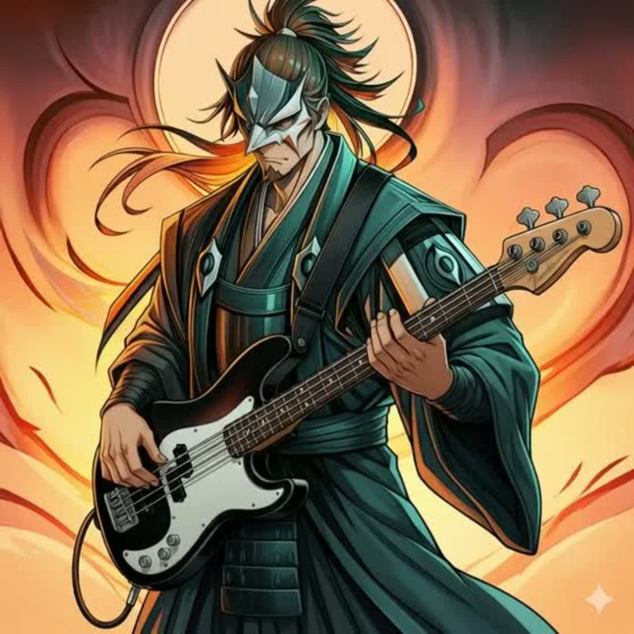 Aggressive slap bass in the foreground, hybrid acoustic–electronic drum kit, sharp shamisen riffs, minimalistic shakuhachi phrases, subtle synth textures