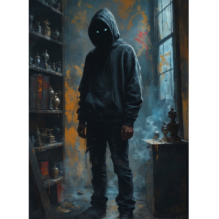 sinister fusion of grunge grit, J-rock urgency, deathcore brutality, all in film-noir atmosphere, music drags through smoky piano chords and sludgy bass before erupting into distorted riffs, blast beats, and guttural growls, Vocals shift from deep gritty baritone storytelling to low growls and harsh screams, layered with ghostly whispers that haunt the edges of the mix, Sinister piano punctuates the chaos, especially in the intro and outro, where noir suspense lingers over static and silence, a style is cinematic and suffocating like the horror and thriller, weaving between slow, menacing grooves and violent bursts of intensity, like a hidden predator waiting in the dark
