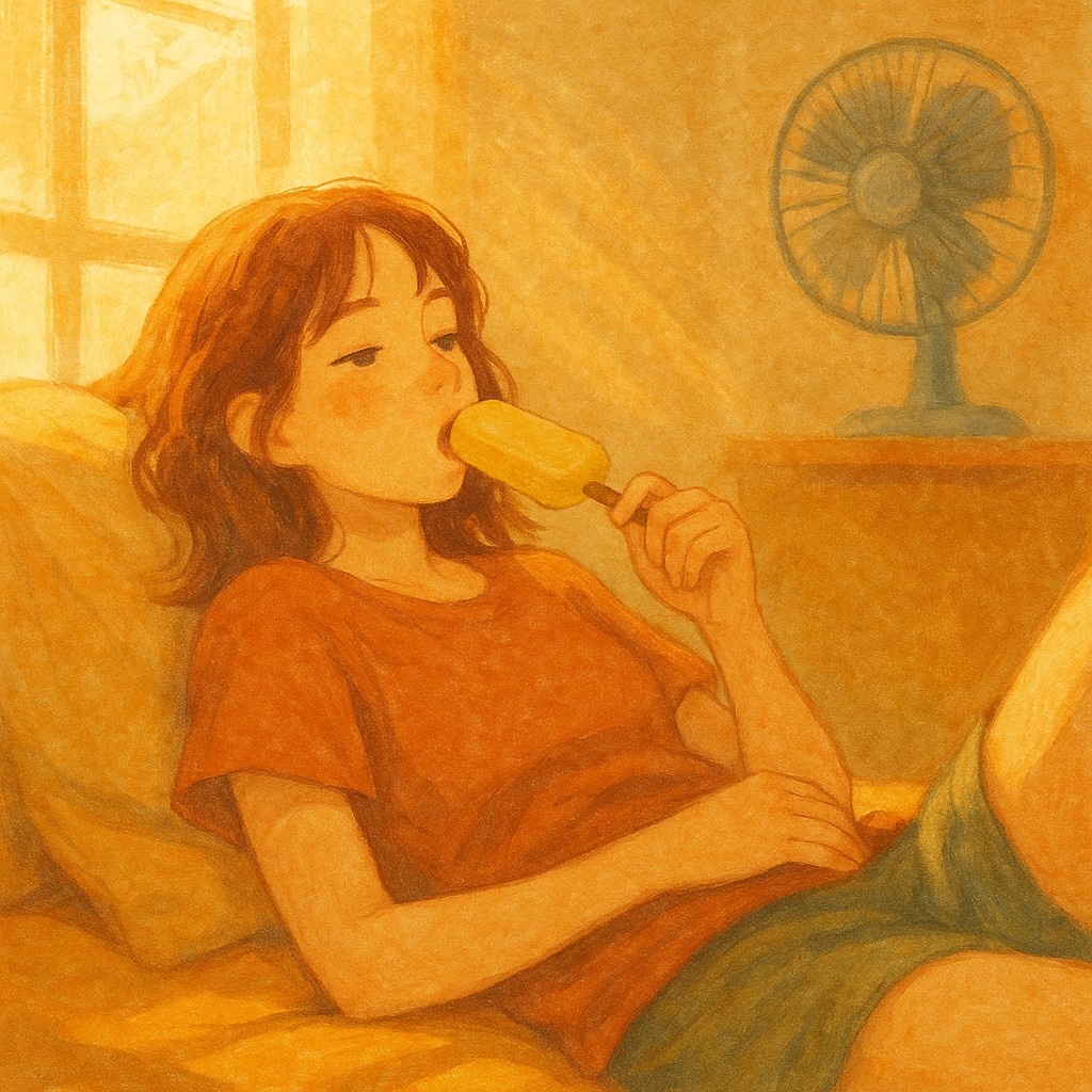 Lo-fi chill-pop with a slow, dreamy tempo (~75 BPM), incorporating ambient vinyl textures, water dripping SFX, distant cicadas, and soft synth pads, Vocals are whispery and emotionally restrained, expressing exhaustion, quiet resilience, and gentle self-acceptance, Ideal for evoking the mood of a lazy summer afternoon in an air-conditioned room, with the world melting slowly outside, Themes include burnout, gentle recovery, and the beauty of ânot doing anything, â, âexcessive layering, âoverlapping piano/guitar, âharsh transients, âphase smear, âdistorted saturation, âsub-bass overload, âovercompression, âlong reverb tails, âsub-bass overload, âharsh transients, âphase smear, âoverlapping piano/guitar, âlong reverb tails, âphase smear