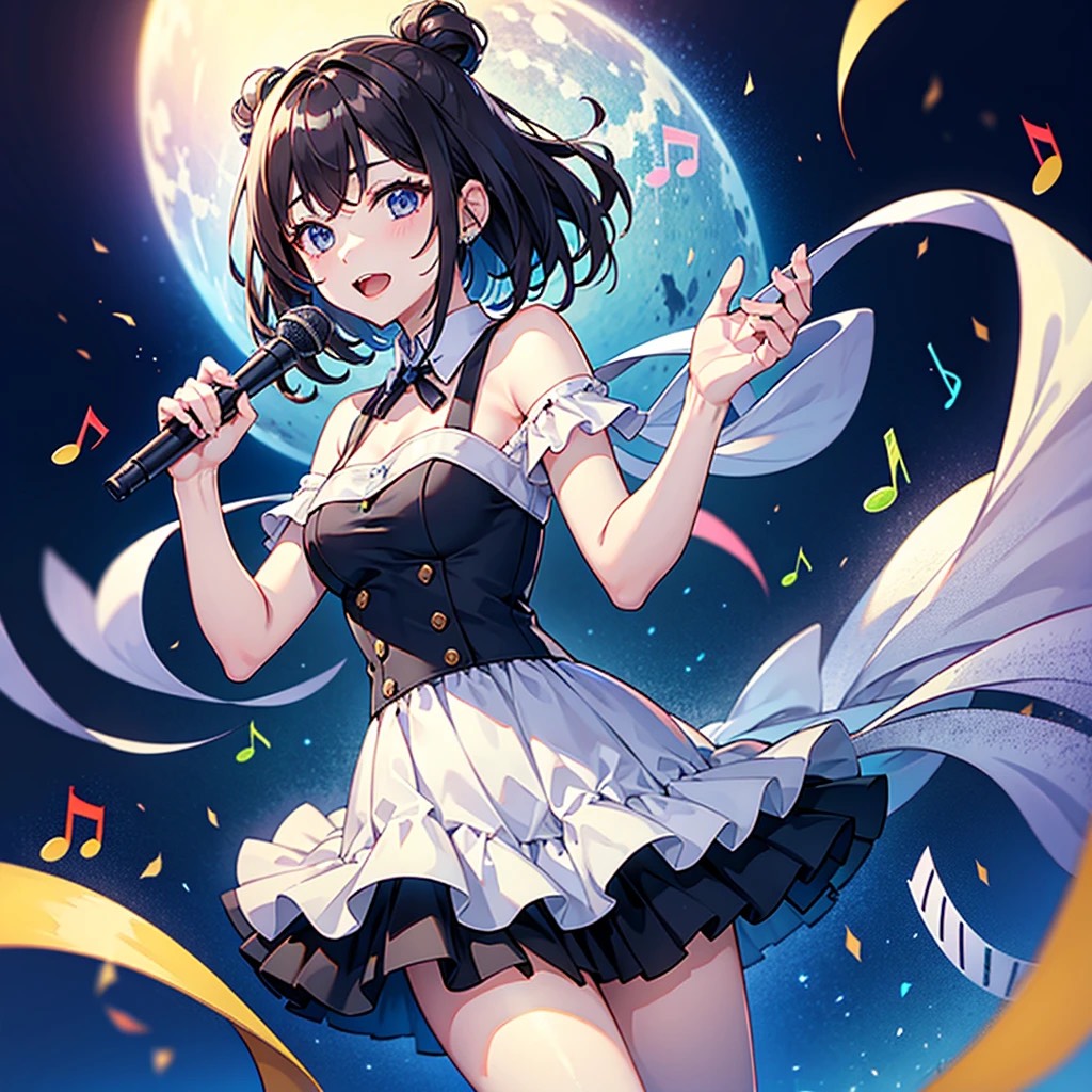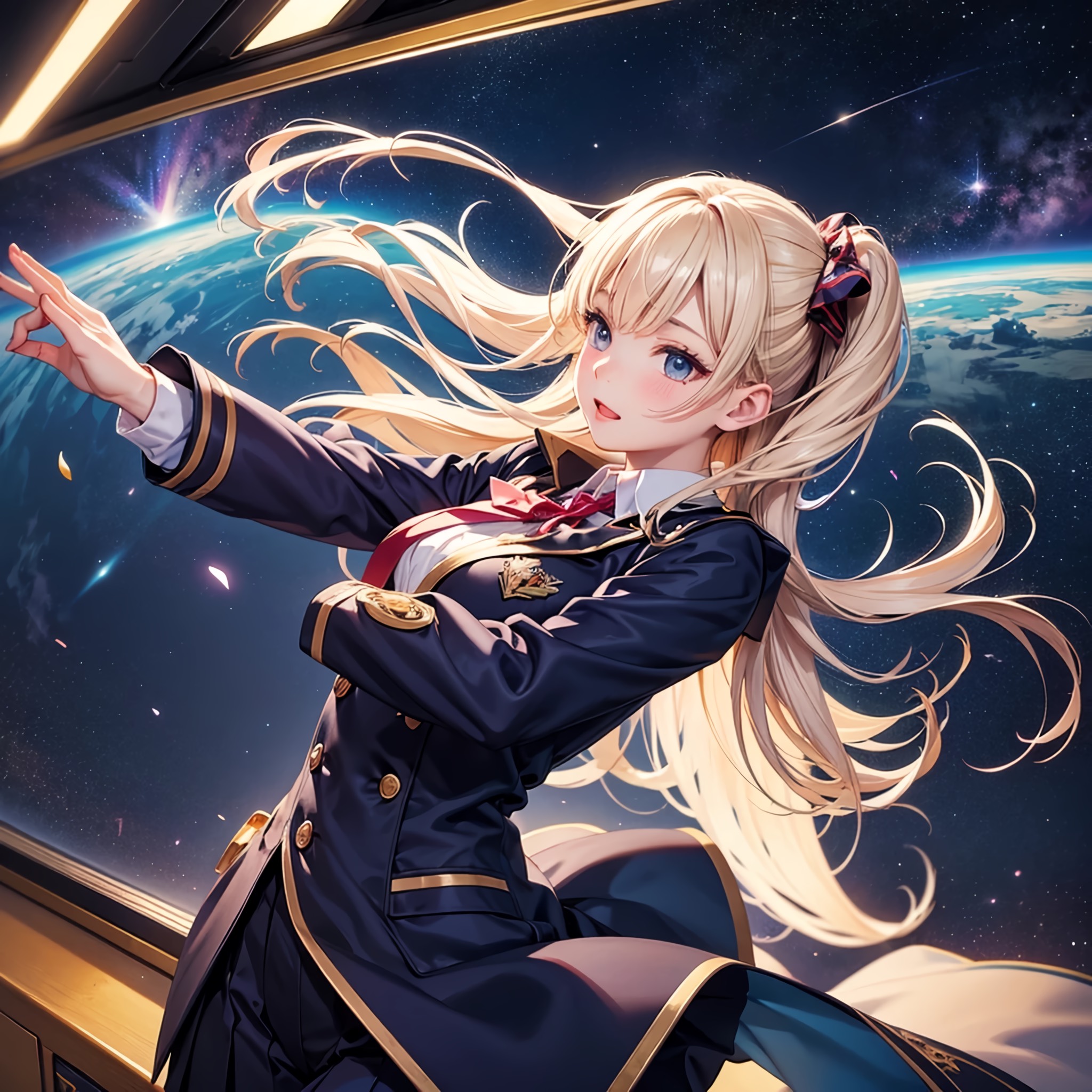 Japanese teenage girl vocals, edm, vibrant, rock band with violin, [upbeat music], [BPM150], [girl group], j-pop, cute voice