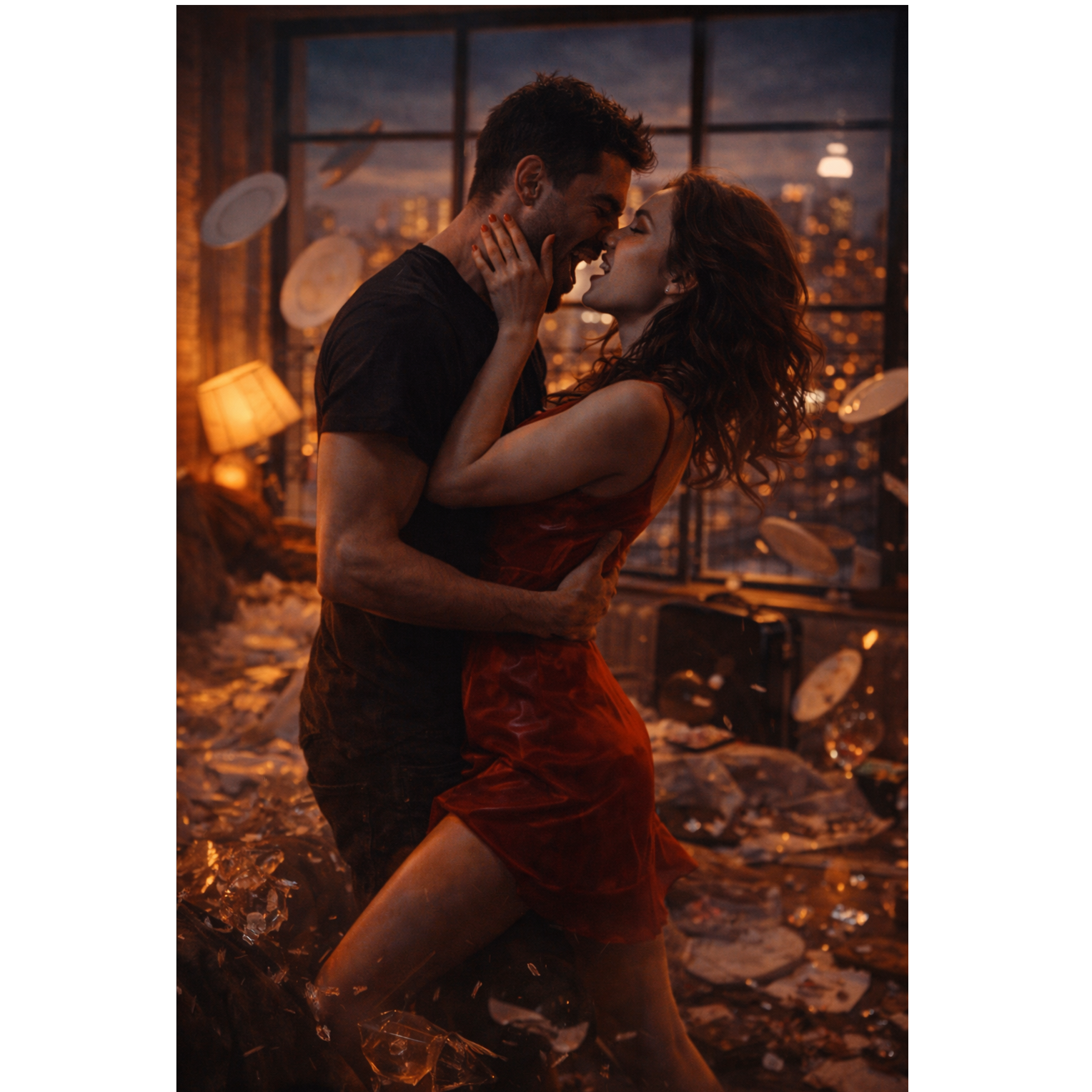 High-energy Afro-Latin jazz arrangement with powerful soul raspy male vocal, rock-n-roll attitude, full brass section, salsa dura groove, Afro-Cuban percussion, call-and-response vocals, and explosive dance energy, Playful, passionate, and dramatic atmosphere with street-romance attitude, toxic love chemistry, fiery emotions, humor, and charismatic performance, Feels like a wild love story told through rhythm, sweat, and sound