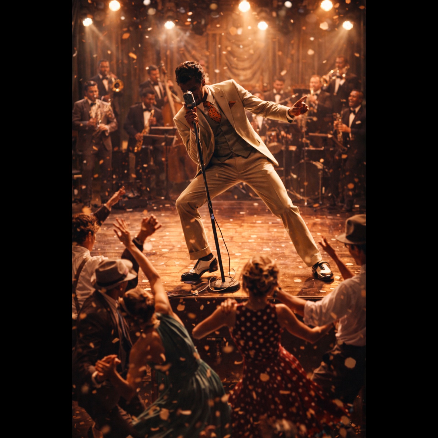 A high-energy rock’n’roll dance track blending disco groove, electro swing rhythm, powerful jazz brass sections, soulful powerful raspy male vocals and African male & female backing vocals