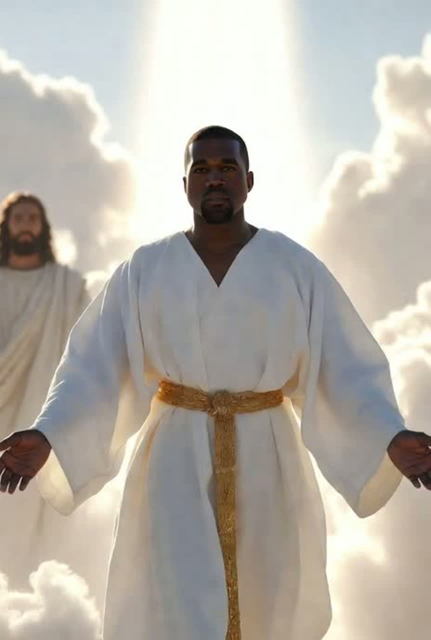 heavenly Kanye West Ye post-cancellation style, Vultures vibe with angelic gospel choirs, raw trap beats, auto-tune distorted vocals, deep heavy 808 bass, groovy profound synths, future bass drops, neurostep builds, epic heavenly nu disco elements, relaxing tech house grooves, vocoder harmonies, idm chord progressions, liquid drum and bass rhythms, organic house atmosphere