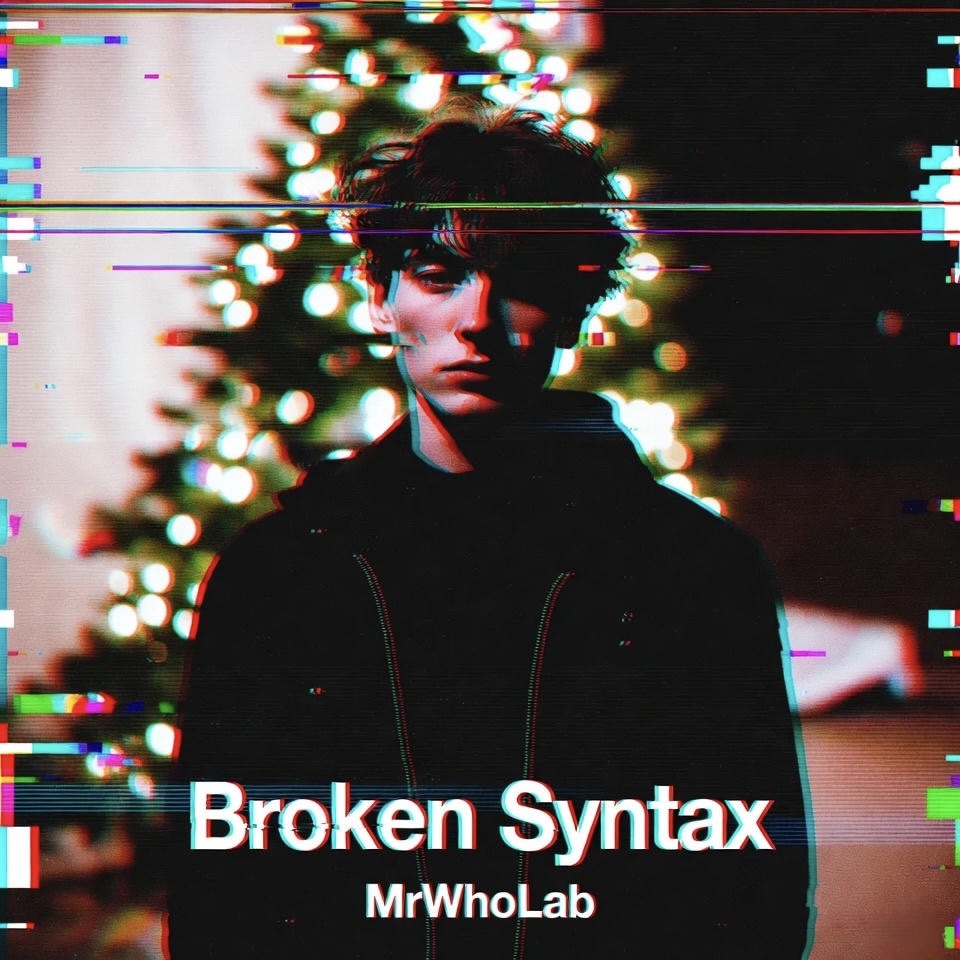 Overall Production: Glitchcore with sad, melancholic vibe, male vocals, erratic glitch effects, distorted synths, stuttering beats, reverb-drenched atmospheres, mid-tempo (80-100 BPM), building to chaotic yet emotional peaks in chorus, evoking glitchy digital isolation and holiday melancholy