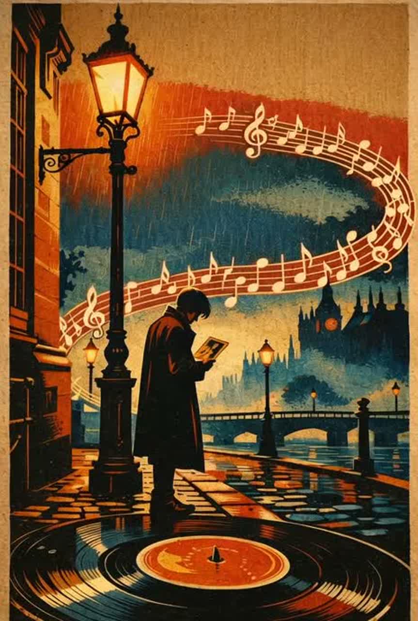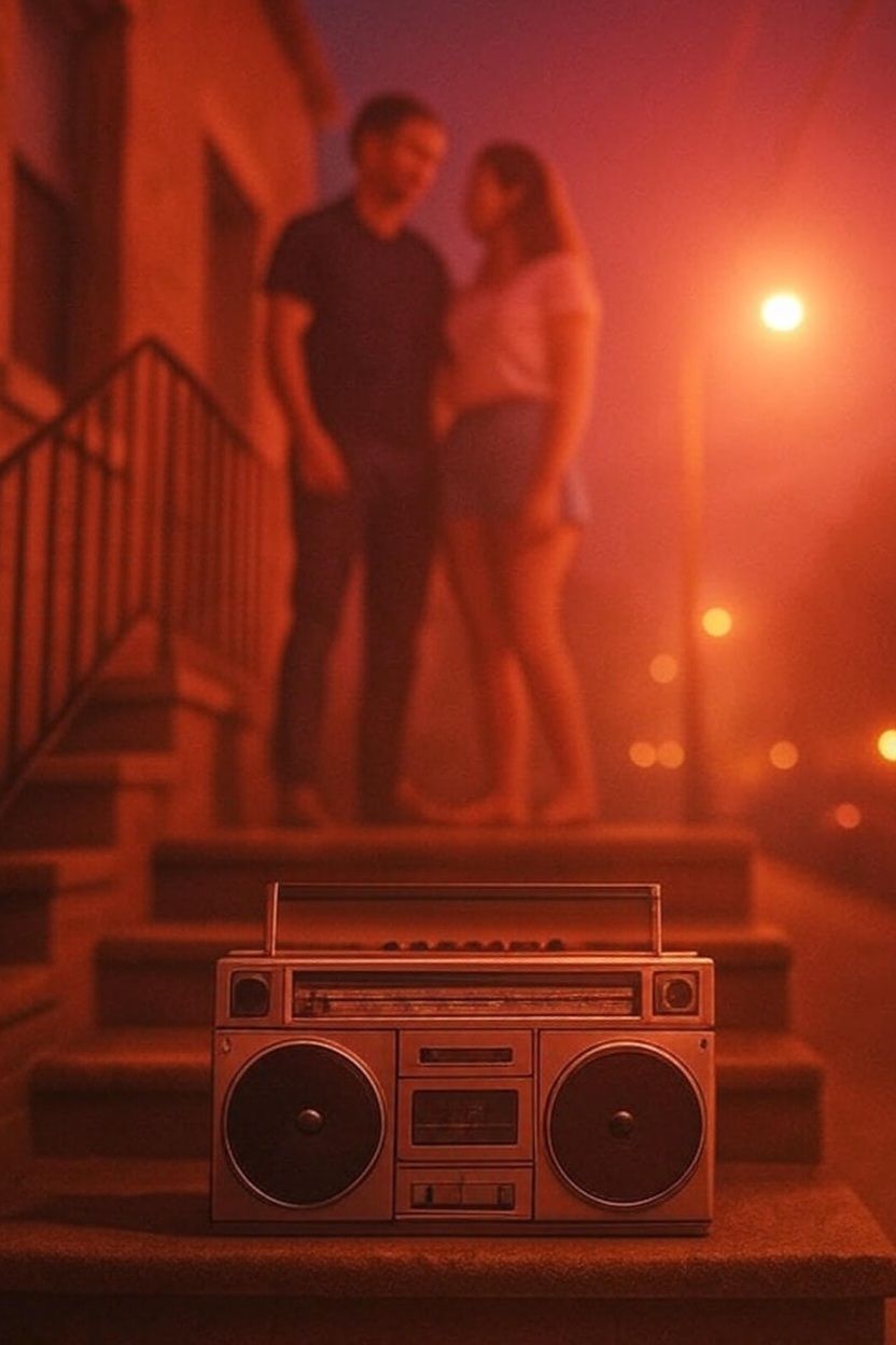 style tags: "real field-recorded rain ambience, light street noise, subtle tape hiss analog noise bed, tape saturation, analog warmth harmonic grit, gentle preamp drive, shimmer reverb early reflections, proximity effect on brass, natural dynamics, narrow to wide stereo image, consistent background noise floor, imperfections kept, building energy intimate to explosive"
