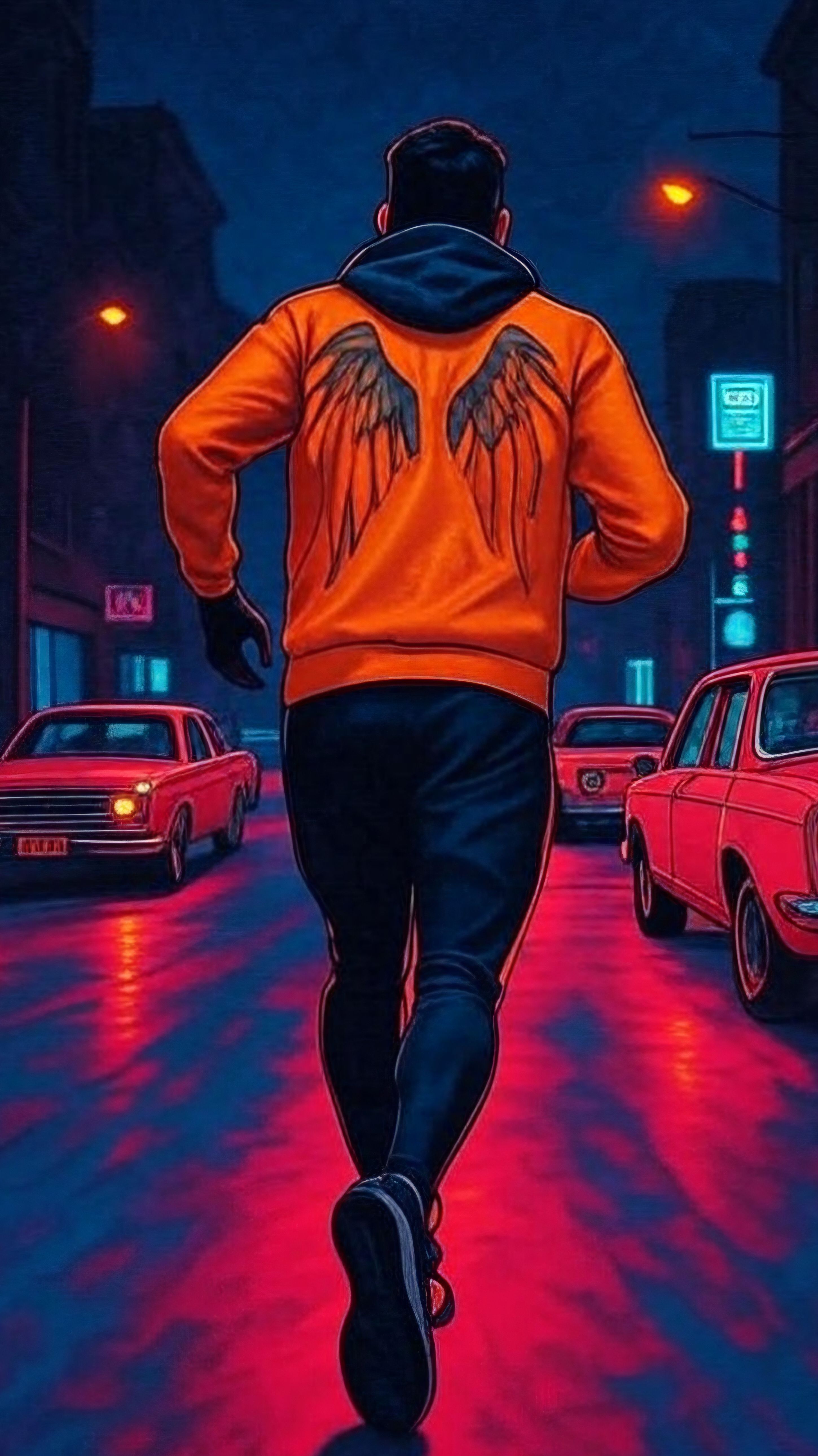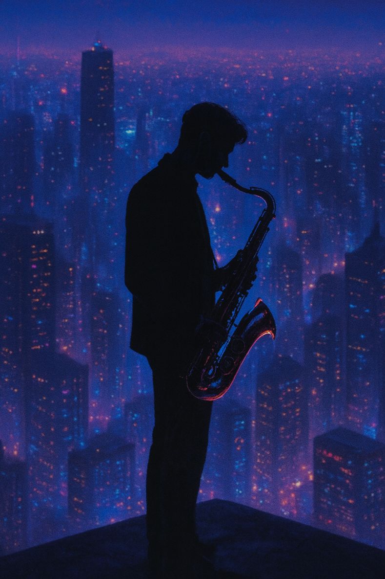 80s-inspired smooth sax instrumental with a dark, atmospheric mood, Slow to mid-tempo, late-night energy within a spacious, cinematic soundscape of deep shadows and soft neon glow, Breath-driven saxophone melodies lead the track, using gentle vibrato, long sustained notes, expressive bends, and intentional silence between phrases to create intimacy and tension, Analog synth pads with slow attack and warm chorus effects add depth and distance, Bass remains minimal and understated, supporting the harmony without drawing focus, Drums are subtle and restrained: soft kick, gated reverb snare, and light hi-hats used sparingly to maintain atmosphere rather than groove, The mood evokes standing alone above a sleeping city at night — distant neon lights below, rain-soaked streets far beneath, and a quiet sense of solitude mixed with calm acceptance, A cinematic noir aesthetic inspired by late-1980s urban nightscapes and smooth jazz fusion, without sounding retro or dated