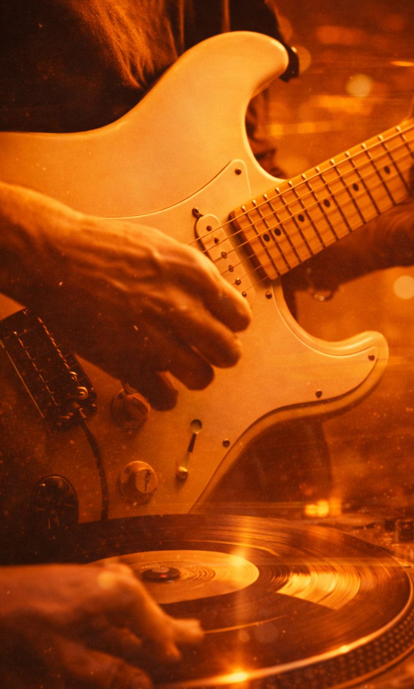 A clean-toned fusion of blues guitar, minimalist garage alt-rock energy, and steady detroit techno rhythms, vocal samples skipping, record scratching, Bright single-coil guitar riffs with light overdrive, expressive bends, and subtle slapback delay, Tight, dry drums blended with electronic 4-on-the-floor kicks, evolving hi-hats, and warm analog synth bass, Clear, spacious vocals with modern, punchy production and a hypnotic, rhythmic groove