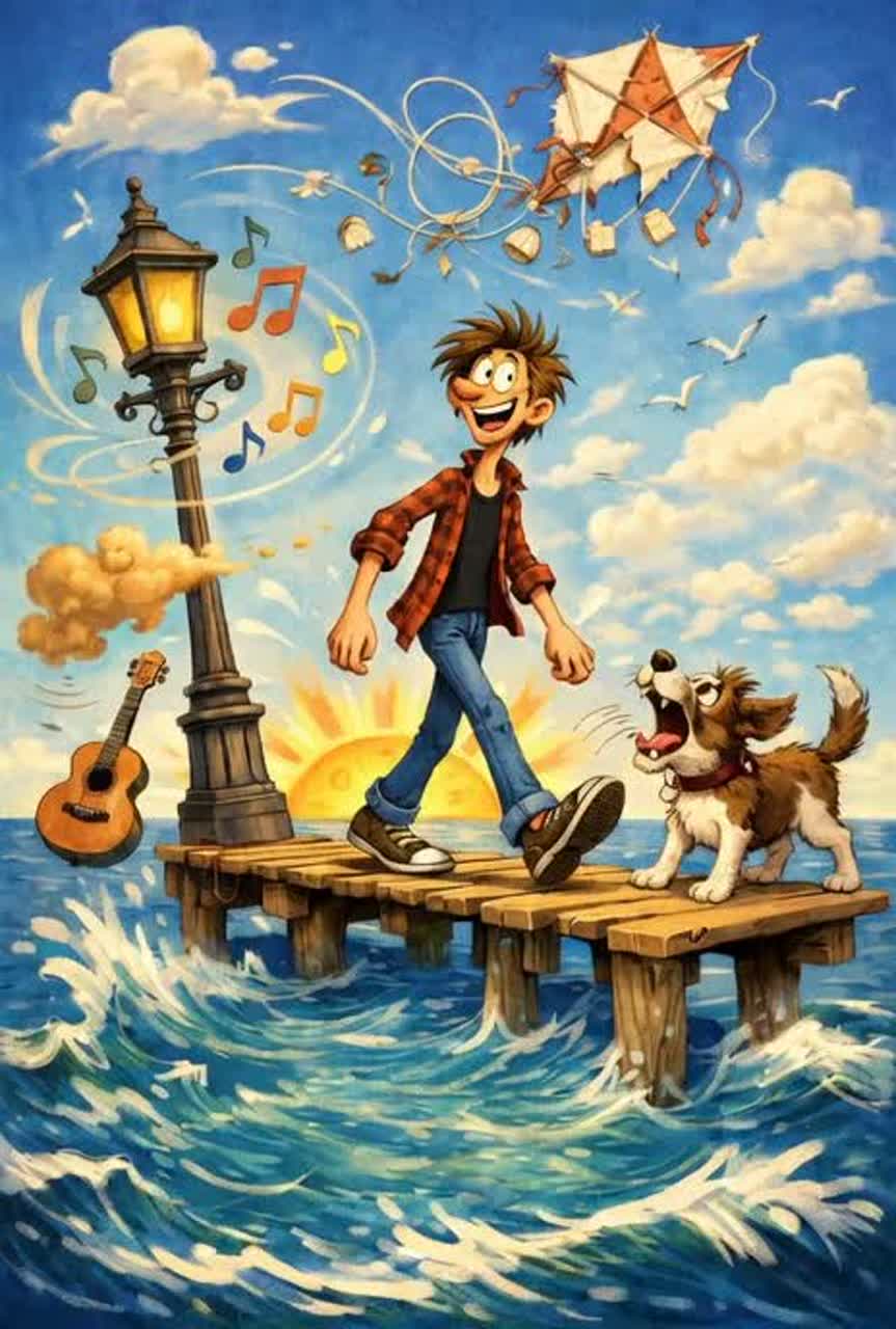 Upbeat 1970s acoustic folk-pop in the key of A major, inspired by, fast, bouncy rhythm with bright fingerpicked acoustic guitar, walking bassline, light snare groove, playful whistling hook, Energetic, slightly nasal conversational male vocal, Catchy, rhythmic phrasing with tight syllables, Fun, mischievous, quirky tone, Warm analog sound, lively and percussive acoustic strumming, Mid-to-fast tempo (~120–130 BPM)