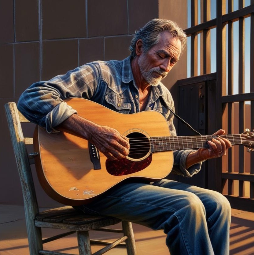 Voicals Deep baritone, raspy, emotional, Blues, Piano, harmonica, Virtuosic acoustic guitar, melancholic, with soft arpeggios and gentle bends