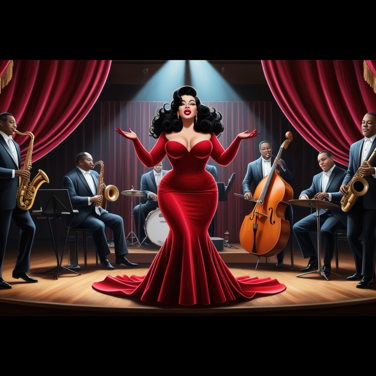slow classic blues, Blues virtuoso singer, Male, two electric guitars (vibrato + slide), Hammond B3 organ, baritone sax, oboe, clarinet, brass section