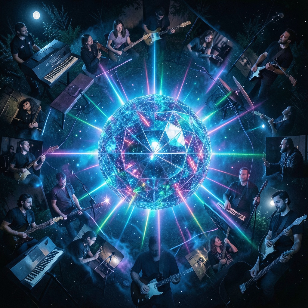 Art Rock, 70s Psychedelic, Upfront Fretless Bass, Lead Hammond B3 Organ, Nylon Guitar arpeggios, Modern Jazz Fusion, extreme loud/quiet dynamics, BPM: 115-155 (Accelerando), beautiful flowing melody, Harmonized melodic Slide Guitar, lush multi-layered vocal harmonies, breathy whispers to powerful soaring voice, breathtaking breakdown, epic climax