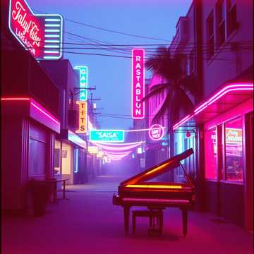 A genre-blending track starts with syncopated reggaeton drums and bright Afro-beat guitar accents, Experimental synth textures swirl above a driving salsa piano montuno and bold brass stabs, Percussive layers evolve, while breakdowns merge congas, electronic FX, and dynamic horn lines