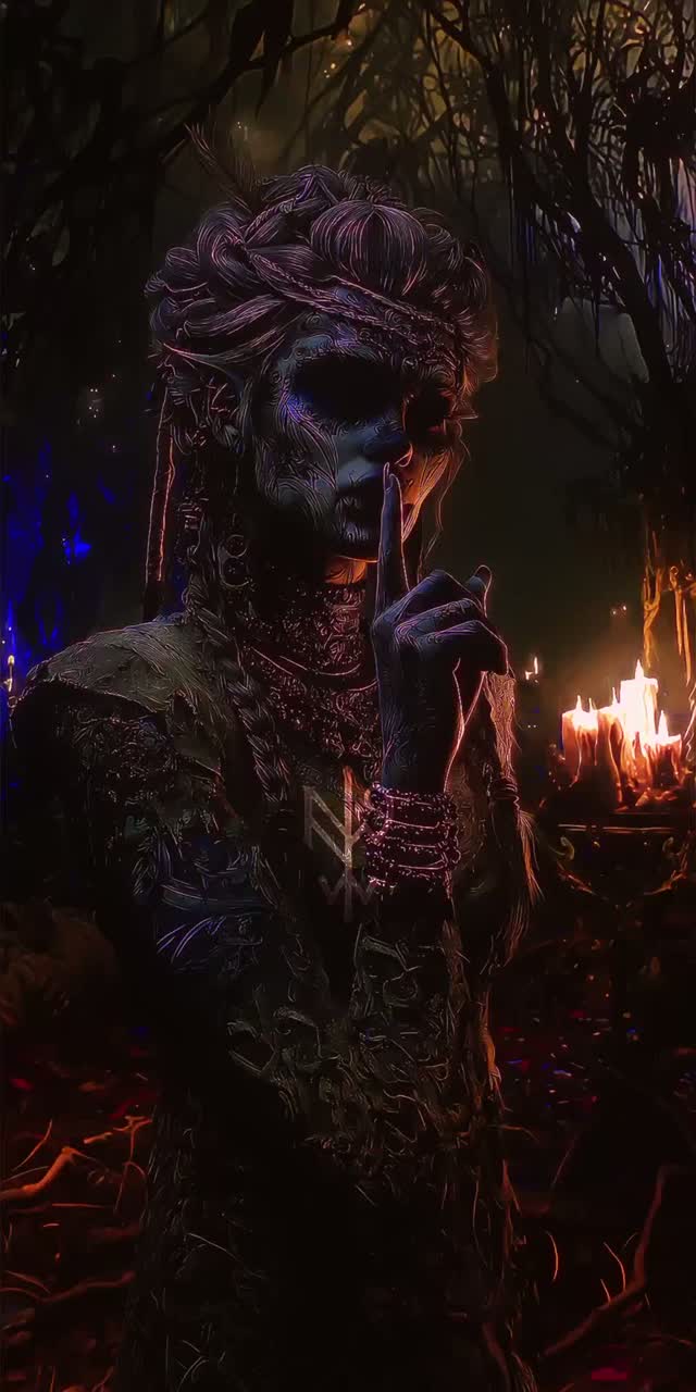 [Genre: Old-World Folktronica × Neo-Medieval Acoustic × Dark Folk] [Tempo: 78–82 BPM, slow candle-lit pulse] [Instruments: lute or theorbo arpeggios, bowed viola da gamba or cello, frame drum and hand percussion with natural room reverb, soft psaltery or harp lines, faint wooden flute or recorder motifs, occasional analog-tape drone for modern tension] [Mood: ancient, intimate, spiritual, sorrowful yet warm; evokes a 1500s chamber performance captured on modern tape] [Vocals: close-mic whispered or half-spoken female voice; occasional ironic giggle; audible breaths and wooden-room ambience; no auto-tune or heavy FX] [Production: organic space, gentle tape saturation, low mechanical noise; layers build like a ritual not a loop; final decay on lute string and breath, ]