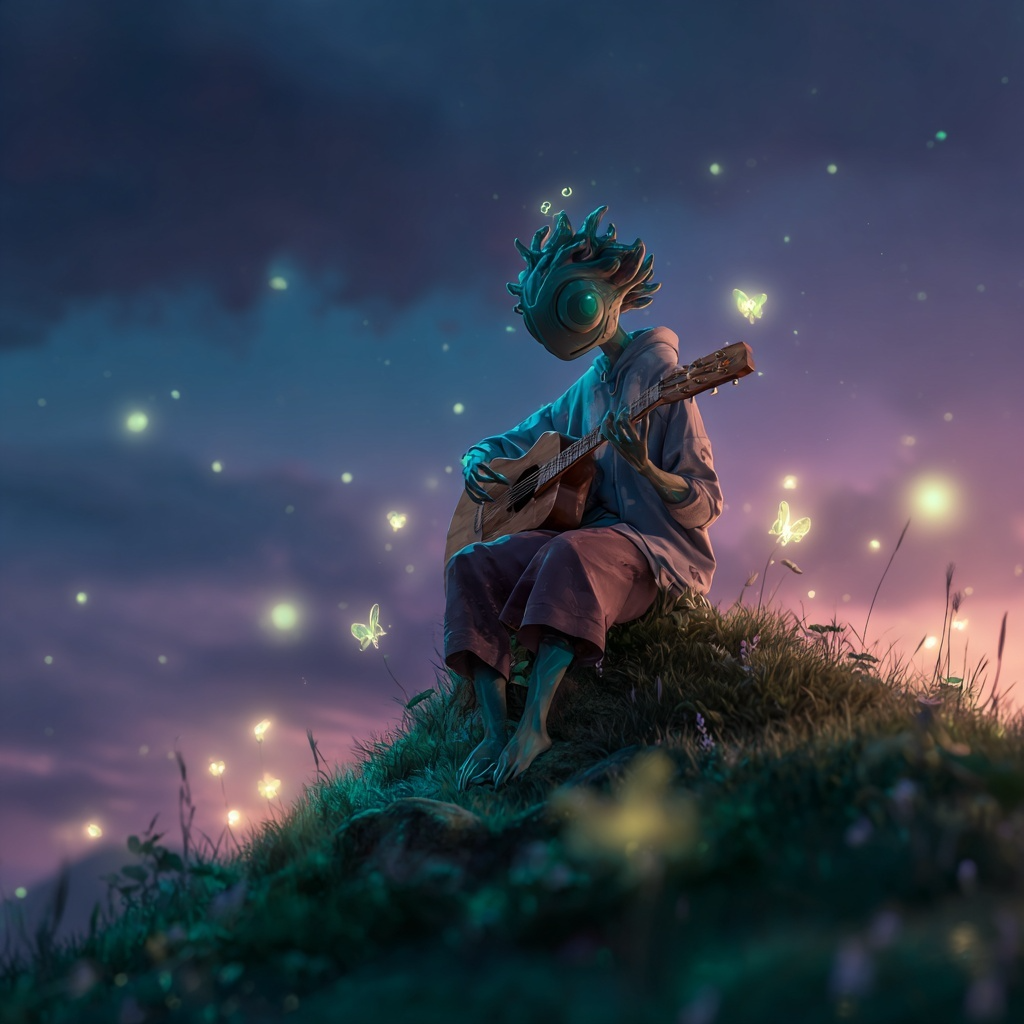 cosmic indie folk-pop singalong with crisp acoustic strums, stomps and handclaps, airy layered harmonies, shimmering electric piano, lush synth pads, and soft glitchy theremin textures; steady mid-tempo pulse (~95 BPM) with dreamy reverb tails and occasional vocoder trails; ambient stereo flourishes and nostalgic radio static for a vintage-future atmosphere; big warm choruses with "oohs" and playful melodic hooks; emotionally earnest but light on its feet; whimsical yet grounded, intimate yet starry-eyed; production evokes starlit road trips, gravityless campfires, and Milky Way magic; vocals natural, slightly shaky, with spontaneous harmonies; perfect for reflecting on humanity from the edge of time, while singing like no one’s listening