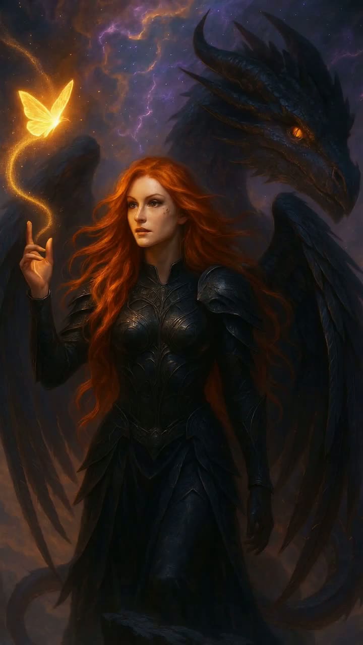 Dark fantasy + ethereal electronic + heavy epic dark metal, Slow but powerful (75 BPM), Deep feminine voice, sovereign, dangerous, Atmosphere = mystical, icy, celestial, forbidden, Deep sub-bass, icy strings, magical shimmering chimes (symbolizing butterfly-light), Dark tribal drums (battle-like), heavy metallic hits, ADD long HEAVY dark metal guitar solos BETWEEN sections (between verse and chorus, and bridge), with fast melodic arpeggios, reverb, distortion, cosmic resonance; not chaotic, controlled, majestic, heroic, No screaming, no growl vocals; only atmospheric background low drones, Sound must feel mystical, EPIC, sovereign, dangerous, like an astral battle protecting forbidden light