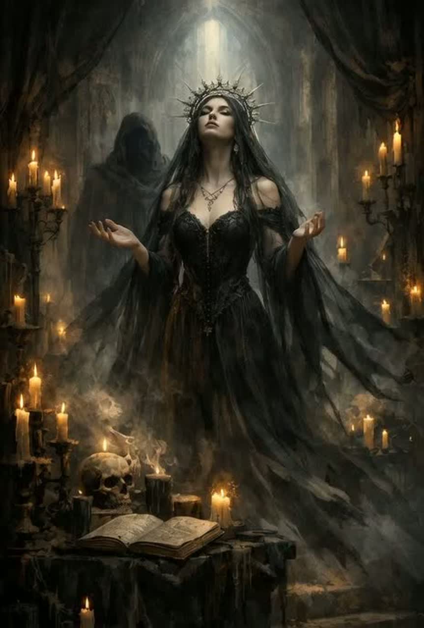 Dark electro-gothic rock track at 128 BPM with strong cinematic dynamics, Atmospheric gothic intro with dark pads, low pulses and distant choirs, Gradual build with evolving drums and rising tension, Ethereal female lead vocal starts soft and haunting, then becomes powerful, emotional and soaring in the choruses, Lyrics explore deep introspection, identity and inner confrontation with dark poetic imagery, Verses are restrained, pre-choruses build pressure, choruses hit hard, Deep male spoken voice used sparingly as dark invocation in the bridge, Mid-track escalation with heavier drums, distorted bass, aggressive synths and gothic rock energy, Explosive climax with metal-influenced power, wide guitars, massive drums and stacked harmonies, No EDM drop, only a dramatic gothic explosion, Dark, intense, elegant electro-rock-gothic atmosphere with polished modern production for cinematic visuals