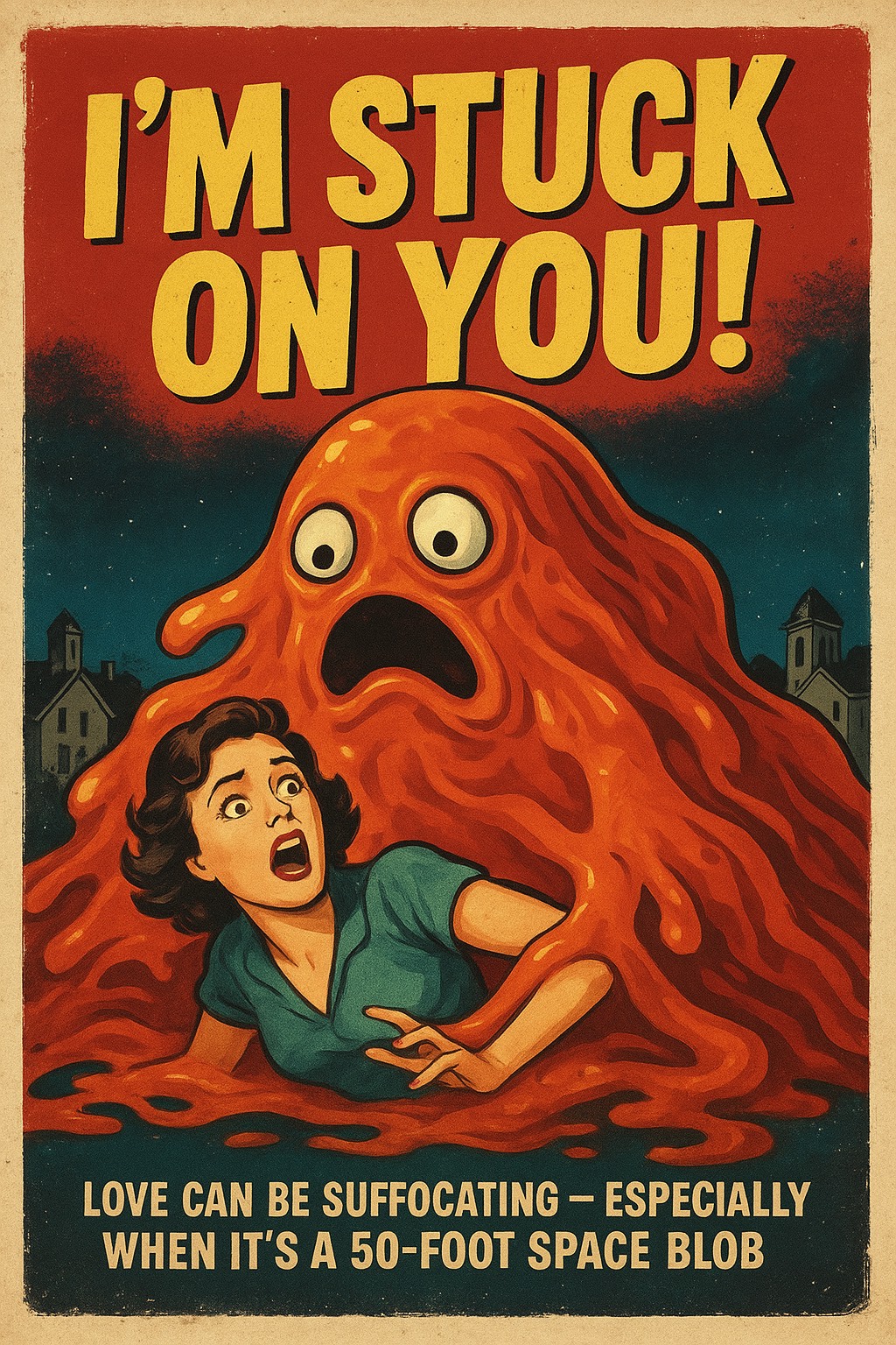 50s rock ‘n’ roll meets 80s campy pop, parody of The Blob movie, Playful doo-wop crooner male vocals with exaggerated comedic tone, twangy guitars, upbeat piano, electronic drums, retro synth stabs, b-movie organ, sax riffs, theremin wails for sci-fi spookiness, backing oohs and aahs, Fast-paced, goofy, ironic with B-movie horror flair, # BPM: 120-140, Male doo-wop crooner vocals with exaggerated comedic tone