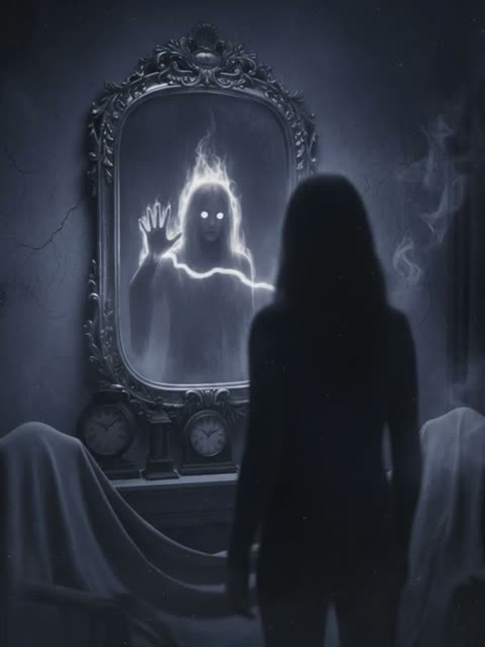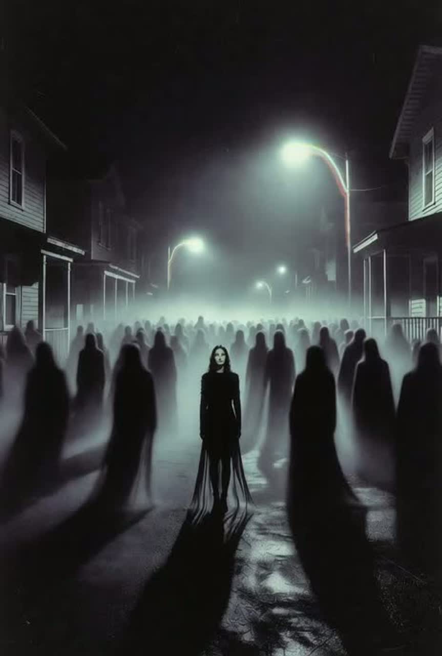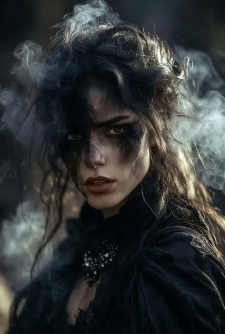 Dark witch house with a haunted, occult atmosphere, Slow, heavy bass and distorted synths, Ethereal pads drenched in shimmering reverb, Female vocals are ghostly and ethereal, delivered in soft whispers, breathy tones, or subtle pitch-shifts, creating a sense of otherworldly presence, Occasional layered harmonics and reversed echoes add an unsettling, ritualistic texture, Deep, ritualistic beats, echoing percussion, and a dense, foggy ambience complete the spectral soundscape, ‑R&B, ‑Jazz, ‑Pop