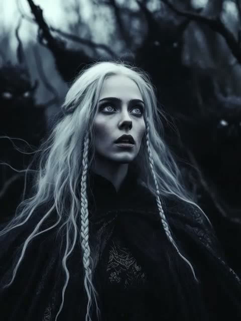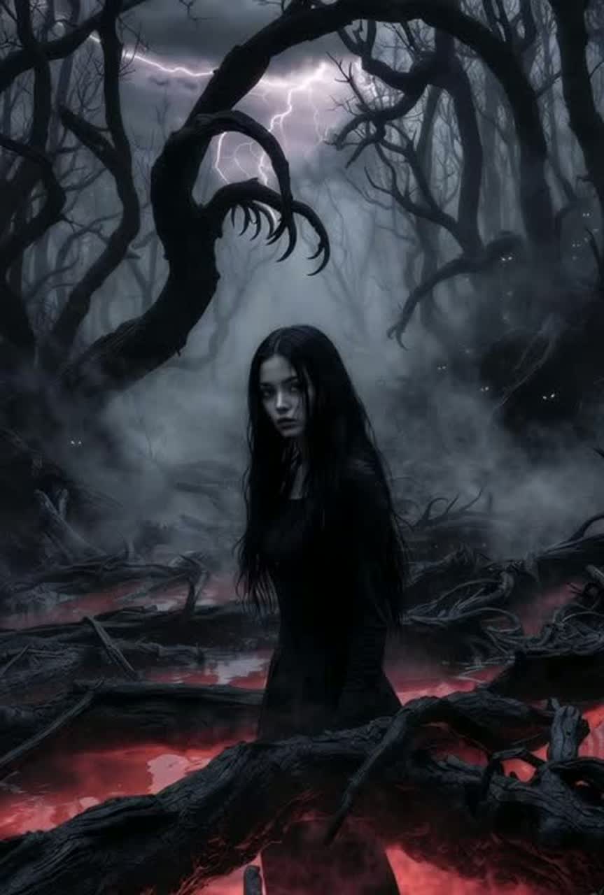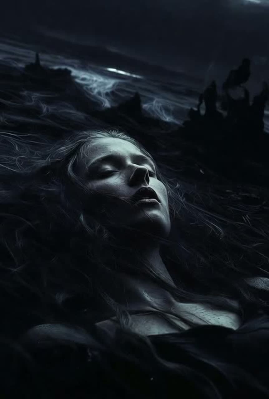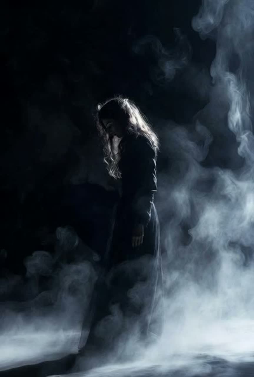 Witch house with a haunted, occult atmosphere, Slow, heavy bass and distorted synths, Ethereal pads drenched in shimmering reverb, Female vocals are ghostly and ethereal, Deep, ritualistic beats, echoing percussion, and a dense, foggy ambience complete the spectral soundscape, ‑R&B, ‑Jazz, ‑Pop