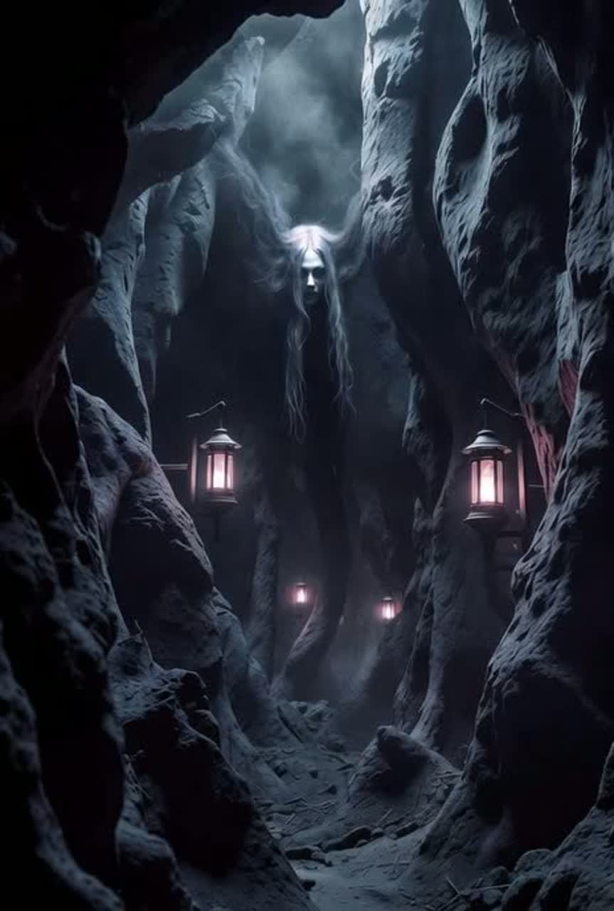 Dark atmospheric Techstep with strong witch-house influence featuring a haunting female vocalist, Industrial 170 BPM drum & bass with cold mechanical drums, deep reese bass, and cavernous sub-rumble, Huge ritualistic atmosphere inspired by underground caves: echoing pads, reversed whispers, dripping-texture sound design, and trembling metallic percussion, Ethereal yet eerie female vocals with a ghostly, storytelling tone, Massive reverb, detuned synths, and slow half-time occult melodies create a claustrophobic, cinematic horror mood—like being trapped deep beneath the earth with something ancient calling your name
