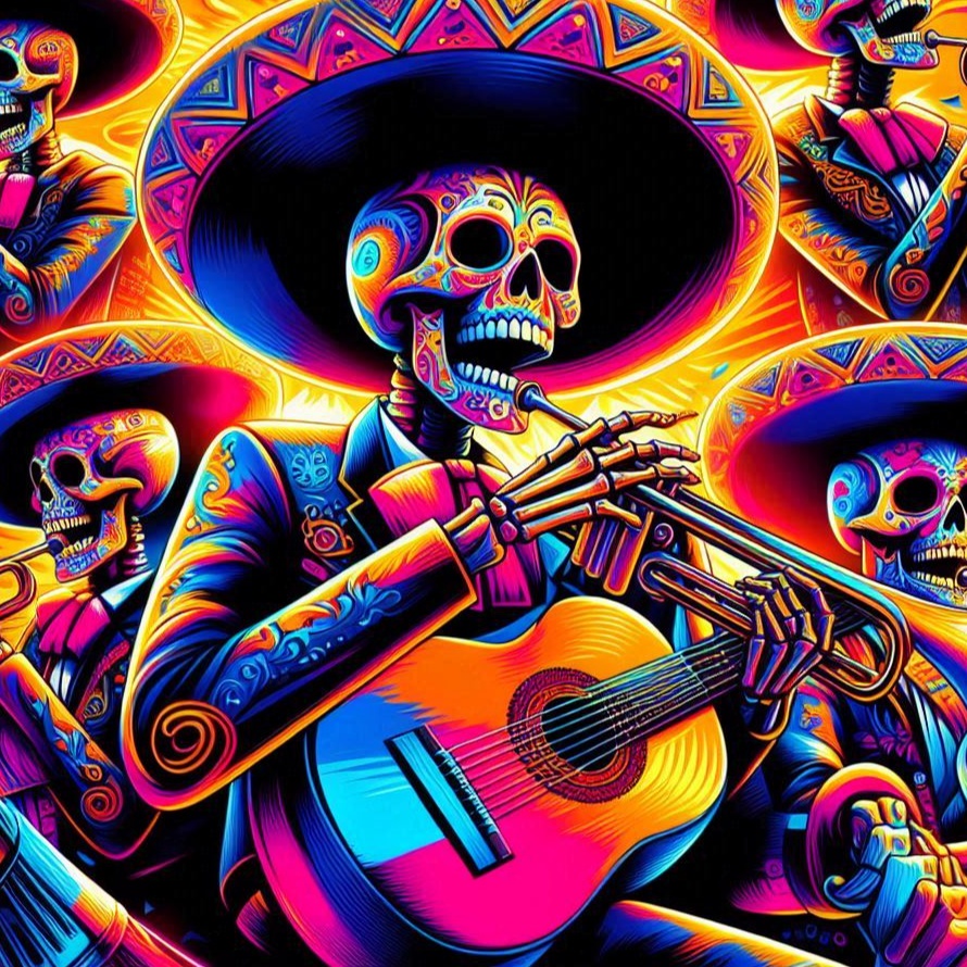 EDM, dance, fast, energetic, heavy bass, beat, bass, Mexican trumpets, brass, mariachi, flamenco guitars