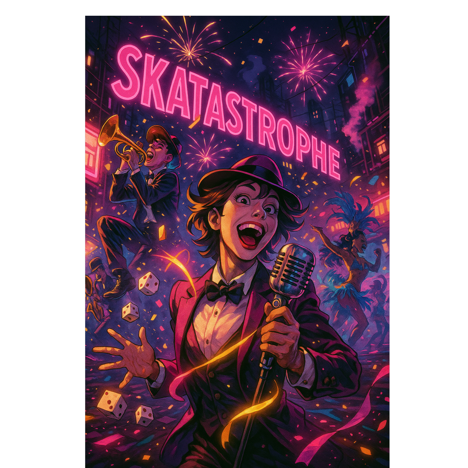 Neon Carnival Overdrive (174 BPM) — drum’n’bass × carnival samba × industrial glitch, Blast-beat kick/snare pace, samba surdo drums, shakers, cowbell groove, Massive distorted reese bass tearing under syncopated carnival brass riffs, Laser FX, glitch stutters, and metallic crashes like collapsing scaffolding, Bridge drops to crowd claps and a lone whistle before bass slams back, Vocals: fast, playful rhythmic nonsense syllables in jazz scat style, alternating with shouted chant calls and short spoken exclamations, wide stereo panning, Delivery is energetic, percussive, and slightly cheeky, matching the chaos of the beat, Mood: chaotic, euphoric, unstoppable