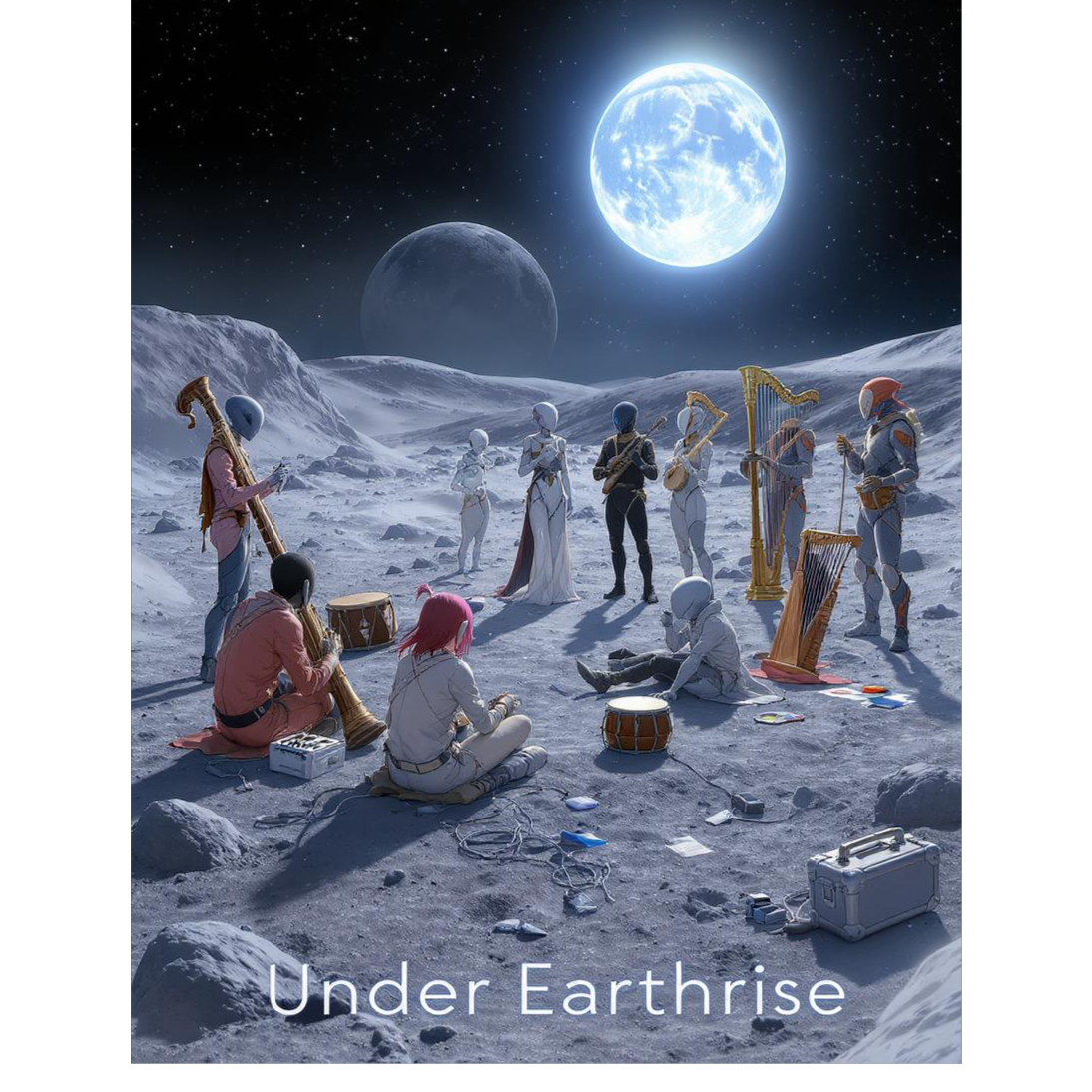Theme: A gathering of unusual friends from distant corners of the galaxy, meeting on the Moon beneath the silent glow of Earthrise, each bringing their own strange sound to the circle, Tempo: 140 BPM, Genres: Modern Dubstep × Synth-Pop × Drone, The track opens with a deep drone from a heavy dense-hardwood contrabassoon and massive steel-framed Moog Taurus pedals, slowly giving way to a pulsing synth-pop groove supported by tight ceramic-bodied darbuka and lightweight goat-skin djembe rhythms, A solid maple shamisen adds crisp staccato melodic texture over digital growls and sub-bass drops, A large stainless-steel waterphone and medium-weight carbon-frame laser harp create ethereal, shimmering accents, peppered throughout the build and breakdown, The arrangement oscillates between dubstep intensity and synth-pop hooks, with a cinematic, otherworldly atmosphere
