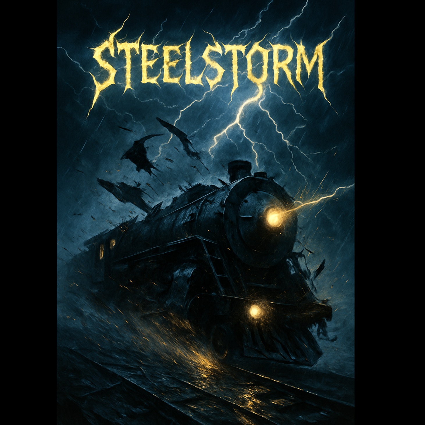 Electro-industrial stormtrack at 160 BPM — nonstop drive like a train in thunder, Thunder Sheet cracks, low pipe organ hits slam like lightning, Screaming distorted erhu and roaring steel guitar weave through the chaos, Deep taiko-style drums, relentless and metallic, Background texture: high-pitched train brake screech — stretched, layered, looped, Ghost vocal loop (“Huuuu — šušušuš”) mimics wind and speed, Vocals: aggressive shouted/growled male voice, raw and commanding — like a steel engine screaming orders through a storm, No verse or chorus — pure forward pressure, You are the train, Wet rails, No control, Just thunder, steel, and motion