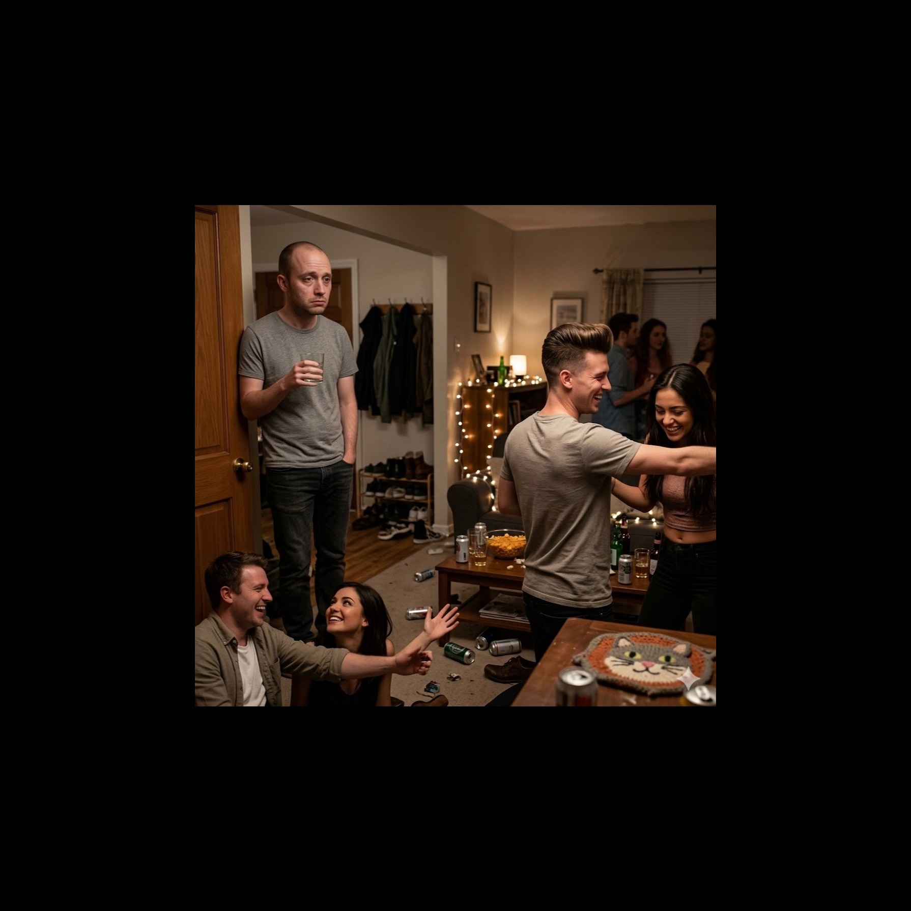 mood: "self-aware insecurity masked as bravado, Bitter funny internal monologue in a crowded room, "