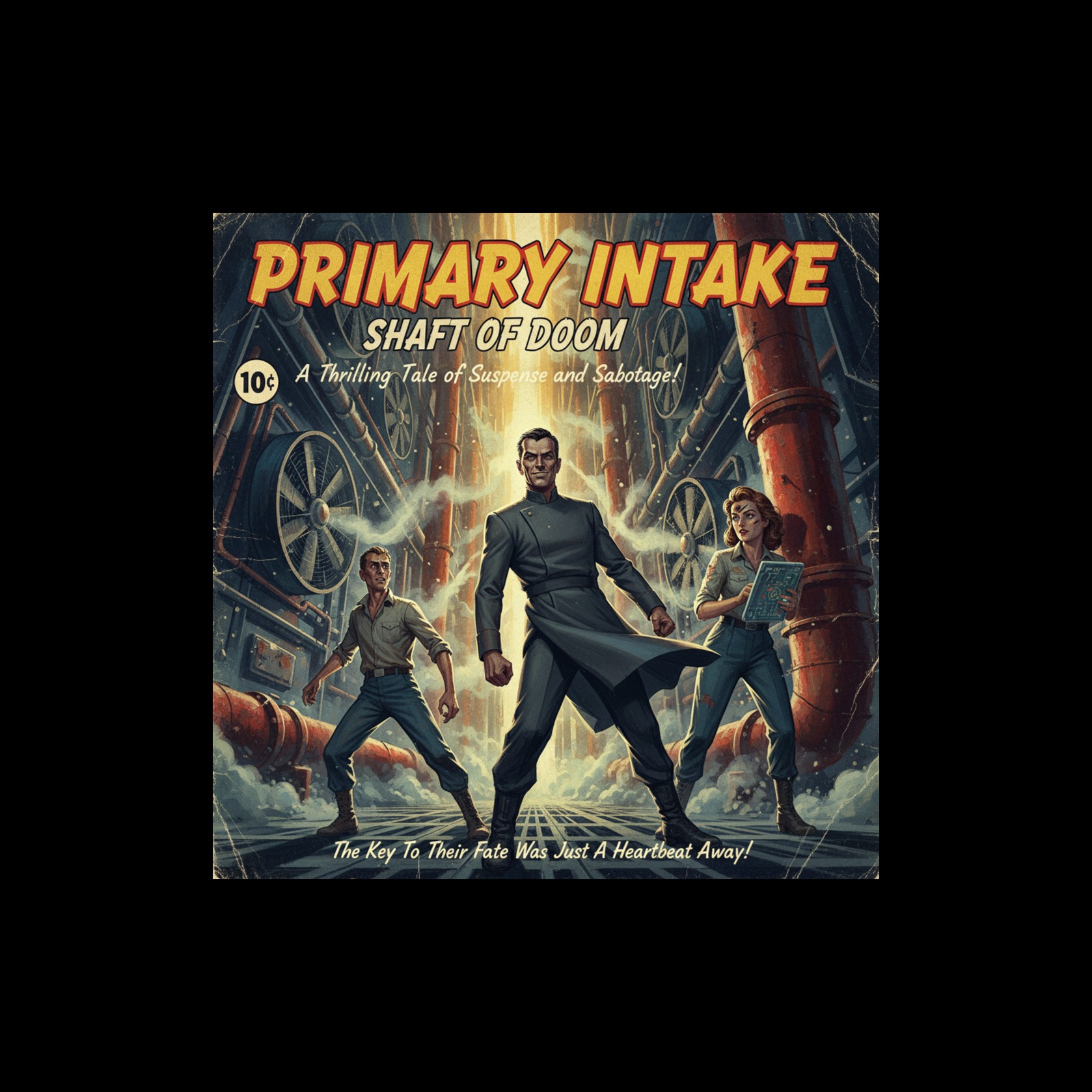 Theremin-led retro sci-fi fused with late Cold War synth thriller + industrial soundtrack design, with a Mission-Impossible-style spy motif, Mid-tempo 110–120, tense and playful-but-serious, Staccato 5/4-feel riff (or tight syncopated ostinato), bongos/hand percussion, muted trumpet/sax hits, plus analog sequencer bass, gated snare, metallic clanks, valve-piston percussion, machine-room drones, warning-beep motifs, Dark organ swells + vibraphone accents, Production: cold analog tone, narrow bunker reverb, tape grit, hard transients, mechanical impacts, Cinematic build → sabotage break → final reprise, Avoid glossy synthwave, EDM drops, bright pop hooks