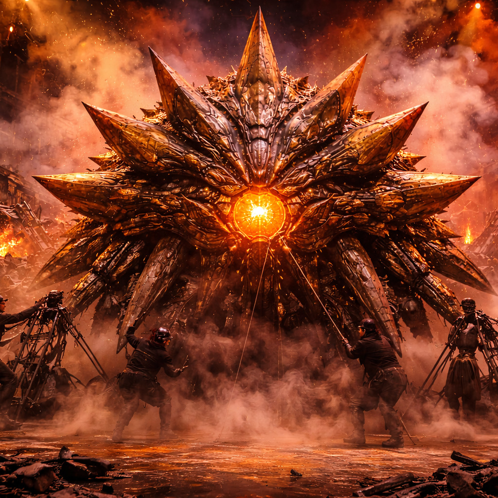 [Style: Single continuous, pause-free escalation from subtle to cataclysmic; brutal rhythmic drive meets orchestral grandeur and glitchy futurism in an unexpected East-meets-machine fusion that feels both ancient and apocalyptic, ]