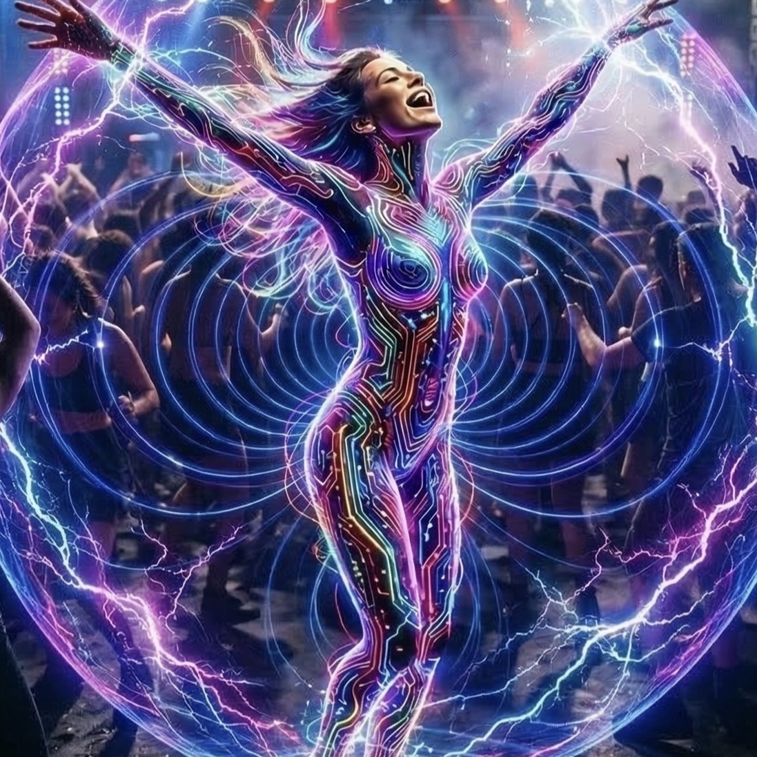 [Instrumentation: Punchy 808 bass and glittery synth stabs for modern neon edge, resonant oud with expressive bends for timeless soul, swirling atmospheric pads mimicking incense smoke, hand-percussion evolving from claps to tribal pulses, electric guitar accents that distort into full fusion climaxes, ]